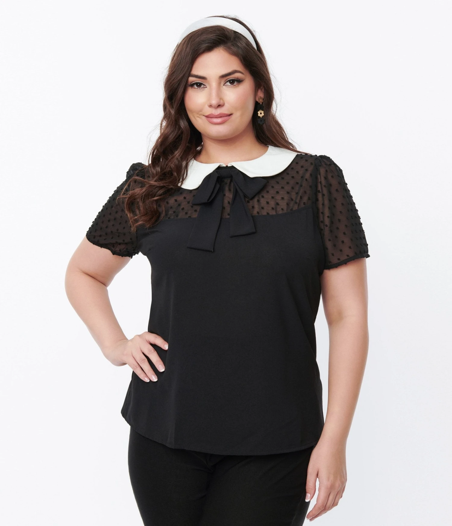 This darling 1960s style blouse is crafted in a lovely black woven crepe fabric and black clip dot detail. Outfitted with a white contrast collar with an attached self-tie bow and short puff sleeves. Complete with a back button keyhole.