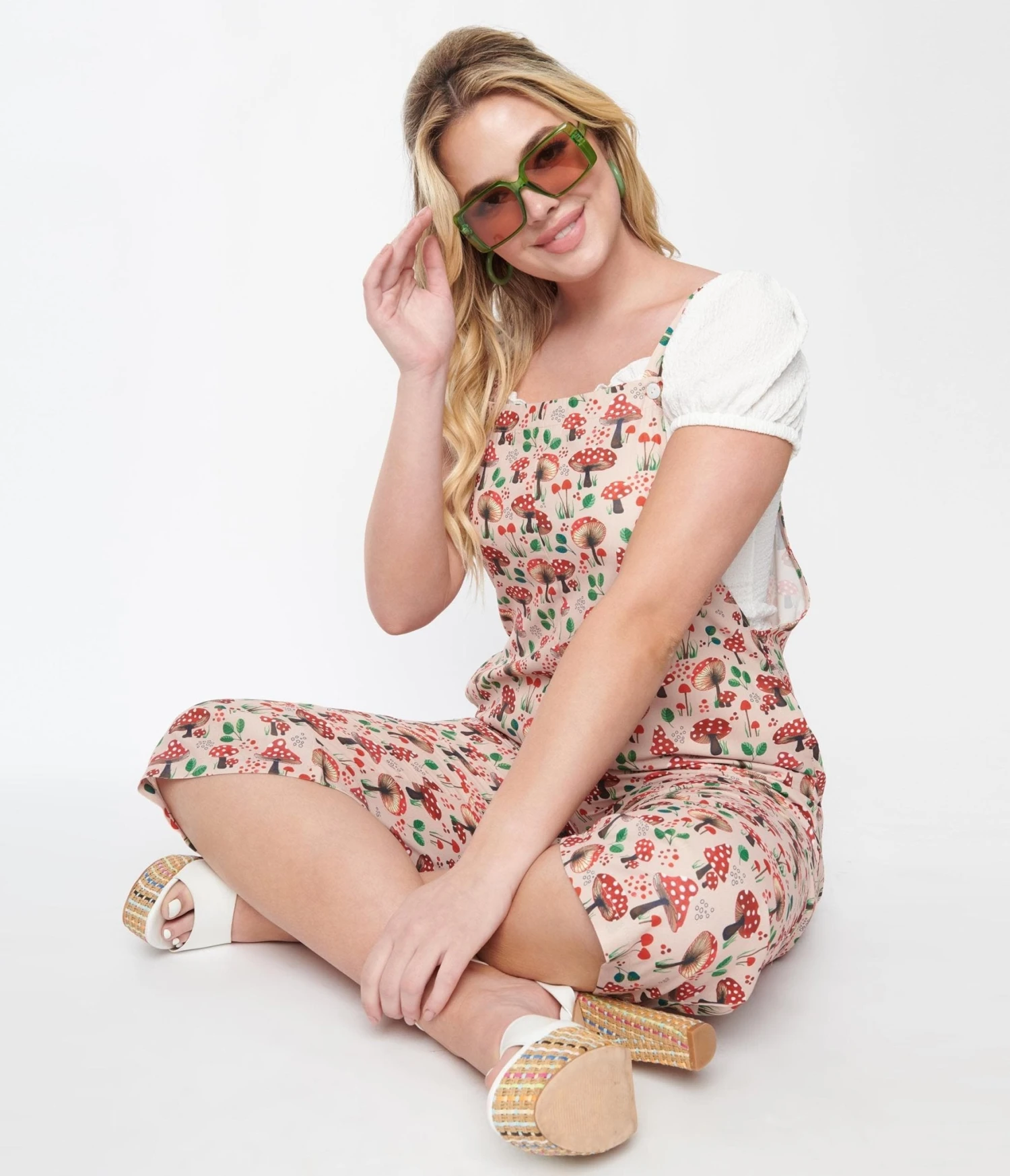 This whimsical jumpsuit is crafted in a tan lightweight woven fabric that features red mushrooms throughout. Featuring suspenders secured with front buttons and capri length, wide leg pant. Complete with side pockets.