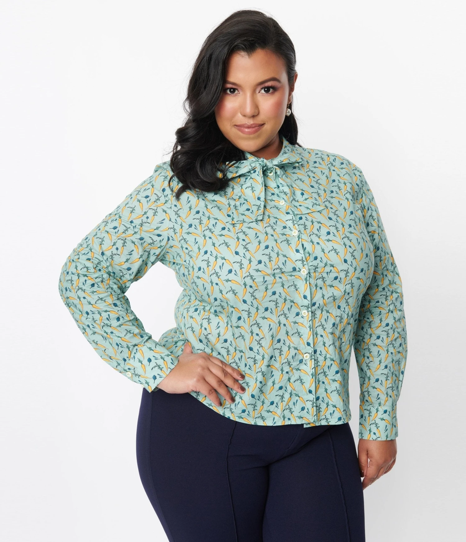 This delightful teal blouse boasts an enchanting allover print of adorable carrots, adding a touch of playfulness to your outfit. The button-up front makes it easy to slip on and off, while the self-tie collar neckline adds a dash of charm. With its long sleeves, this versatile blouse is perfect for keeping you cozy during those chilly days.