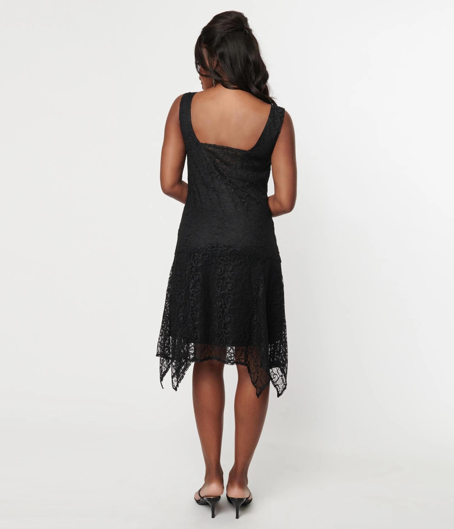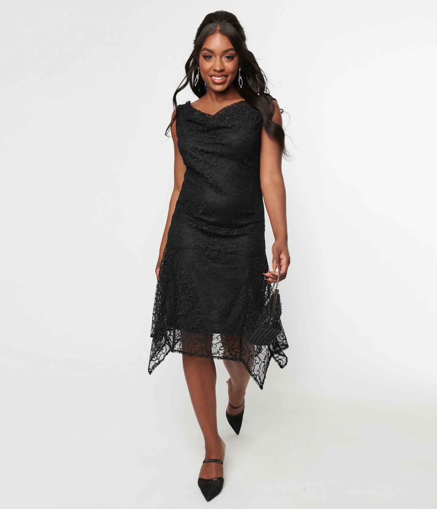 This elegant 1920s aesthetic dress is crafted in black lace and set in a vintage flapper design. Complete with a cowl neckline, asymmetric hemline, and black lining.