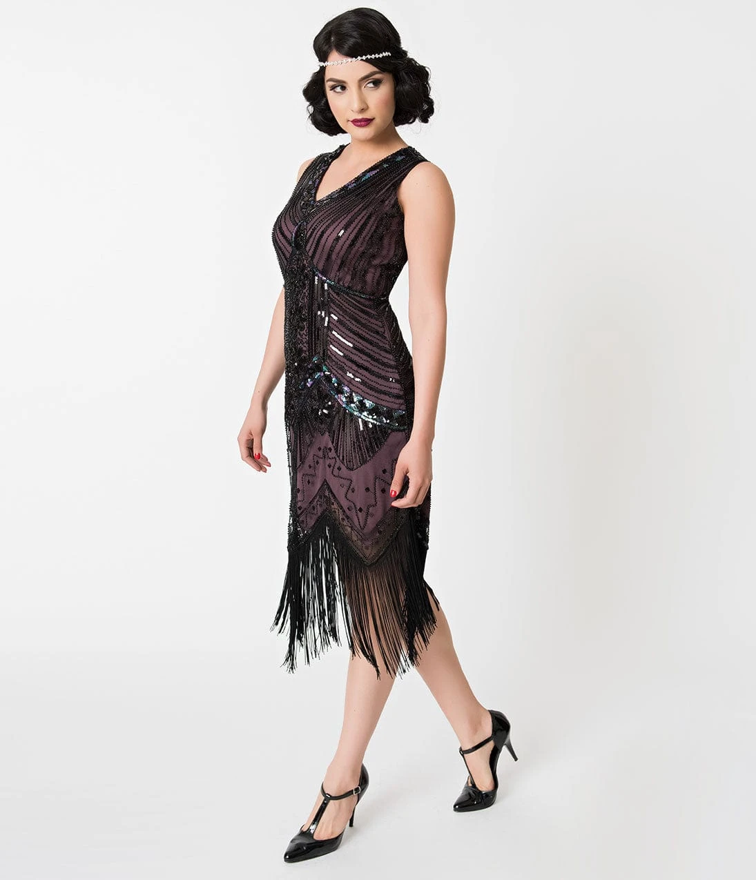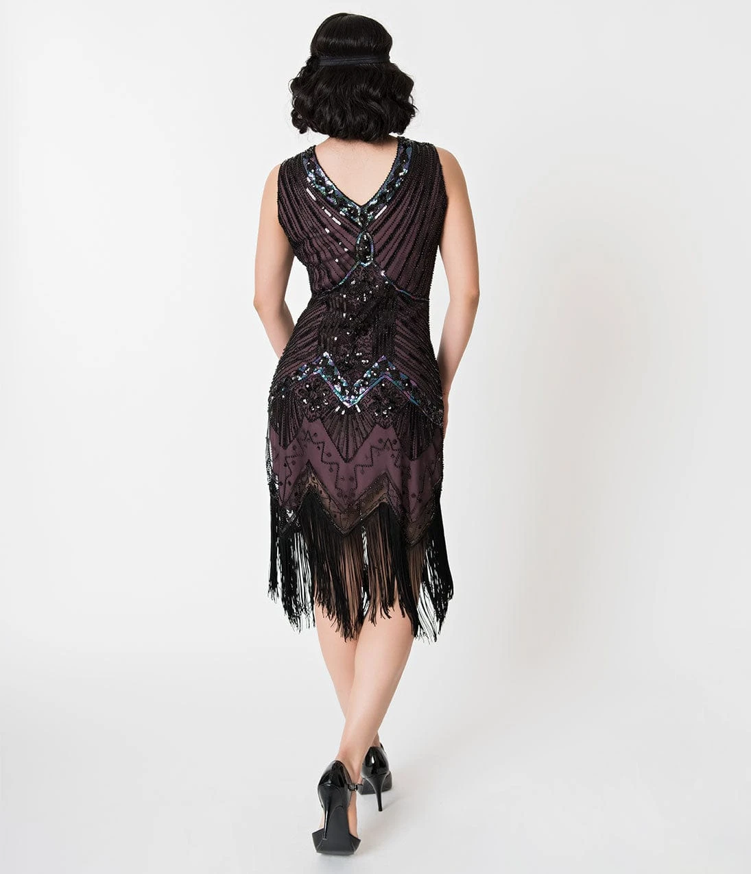 With a bit of royalty and aristocratic detail, the Veronique Flapper dress is fresh from Unique Vintage in stunning 1920s design. Intricately deco beaded black mesh boasts black iridescent sequins and small black beads wrought in flourishing deco swirls and spirals, while a deep eggplant purple knit lining creates a radiant effect. The sleeveless, v-neck design shows you off with a modest touch, while the curve hugging fit and jagged edge dripping with fringe will turn every head!