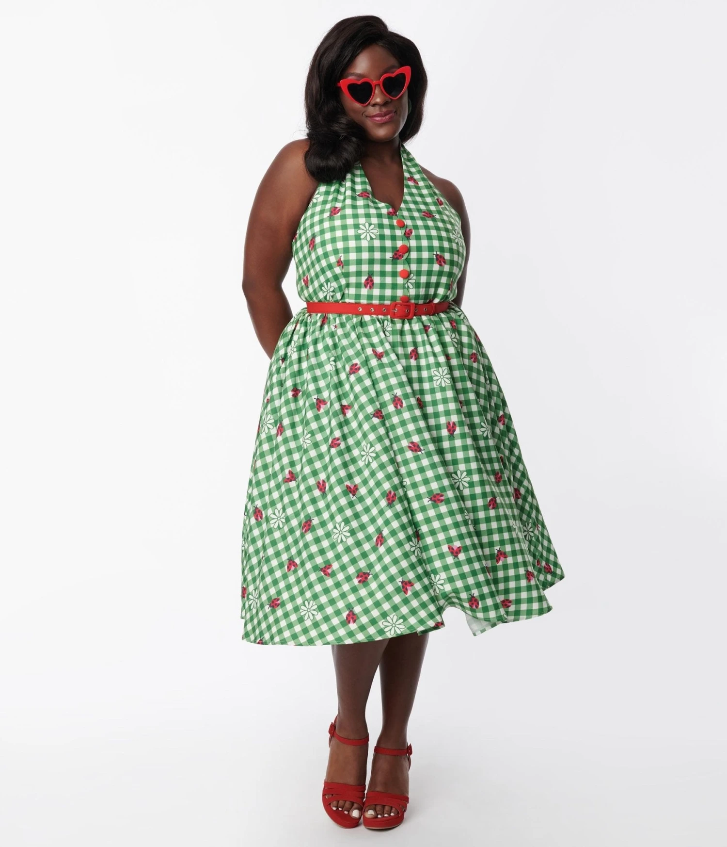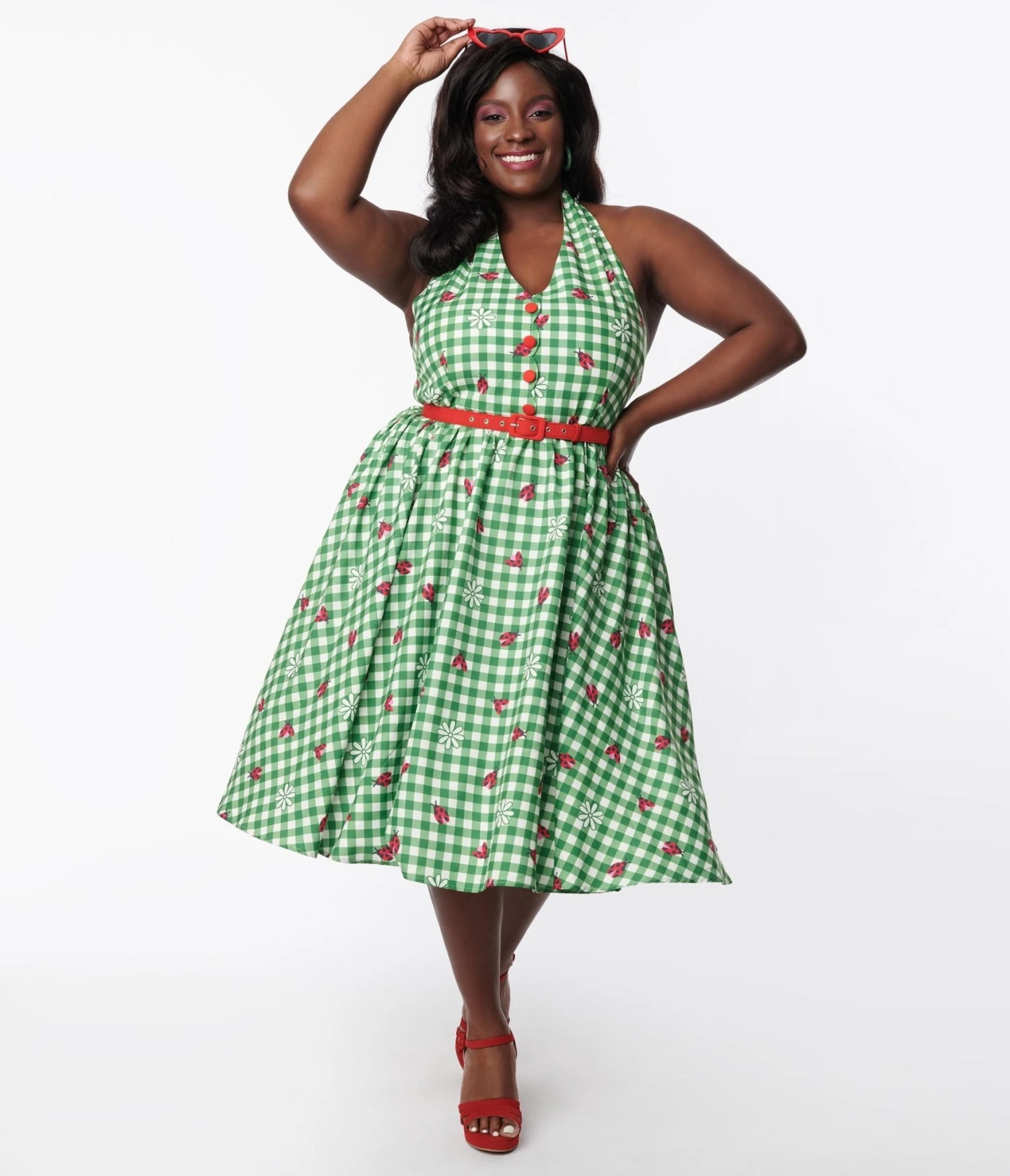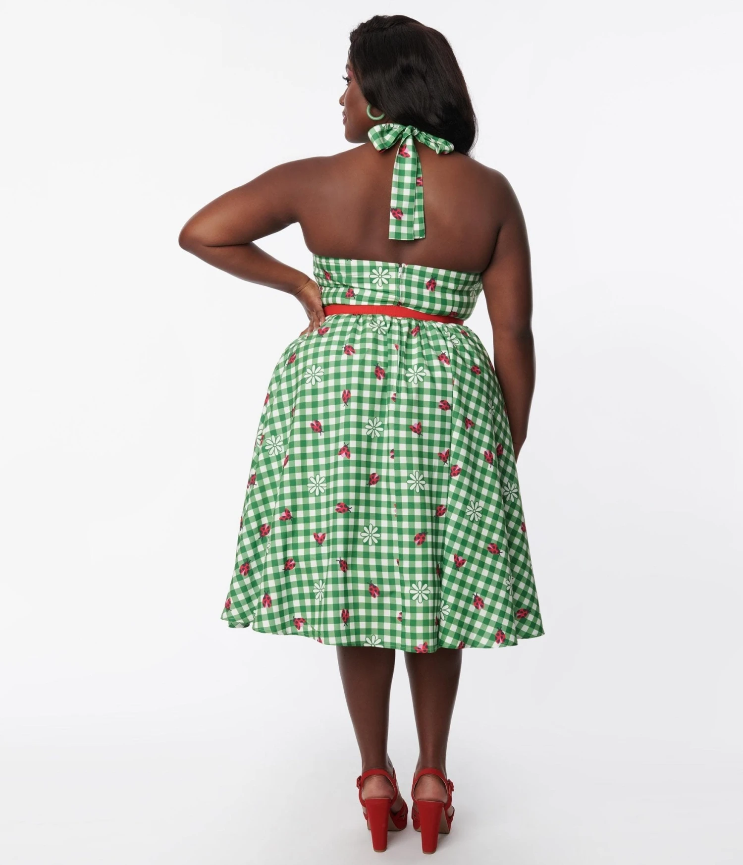 This adorable 1950s style swing dress is crafted in a smooth woven fabric that dances with charming ladybugs and florals throughout the green gingham backdrop. The self tie halter is framed by the sleeveless silhouette, while the full swing skirt is cinched by a red belt.