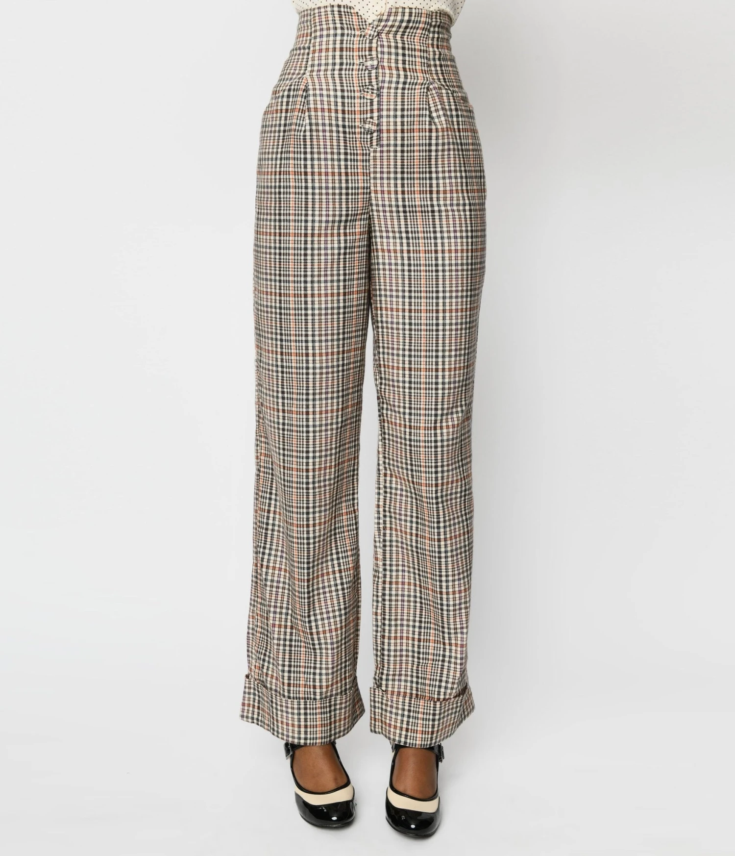 This pair of 1940s inspired trousers is set in a beautiful beige plaid woven wide leg silhouette. Outfitted with an exposed button up and front pockets.