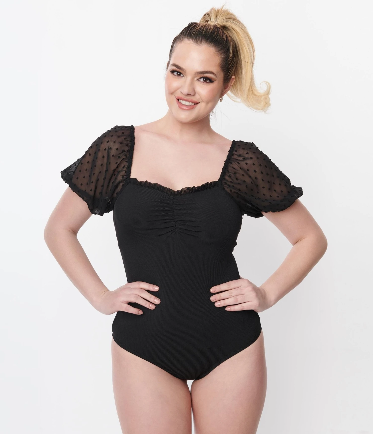 This romantic 1940s style bodysuit is cast in a black stretch knit. The ruffled sweetheart neckline is framed by flirty short mesh pin dot puff sleeves, while the elastic banded shoulders lend versatile wear. Secured with a snap button closure.