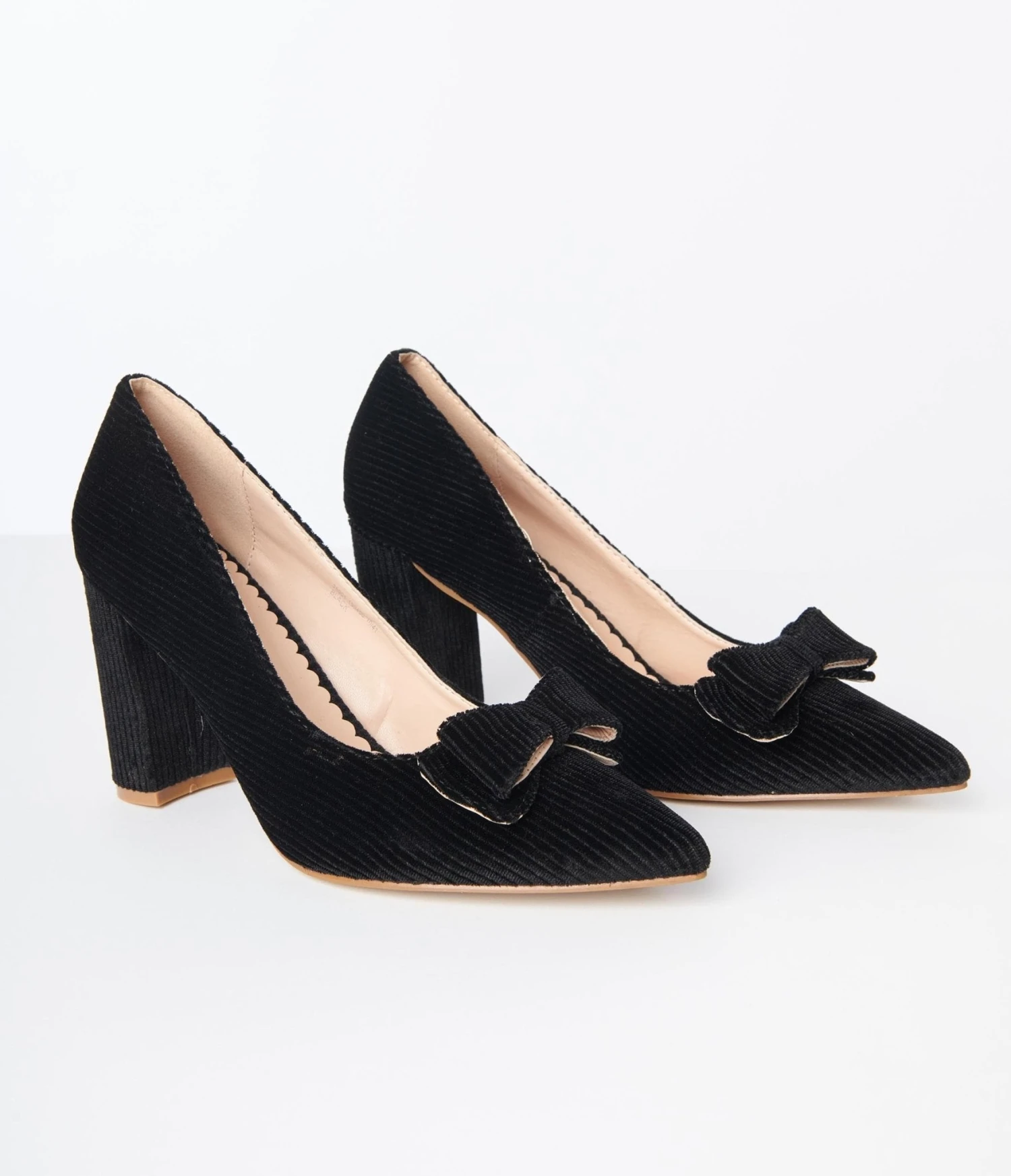 A vintage dream in black corduroy, these pumps feature a 3.5 inch heel and a darling pointed toe, embellished with a bow.
