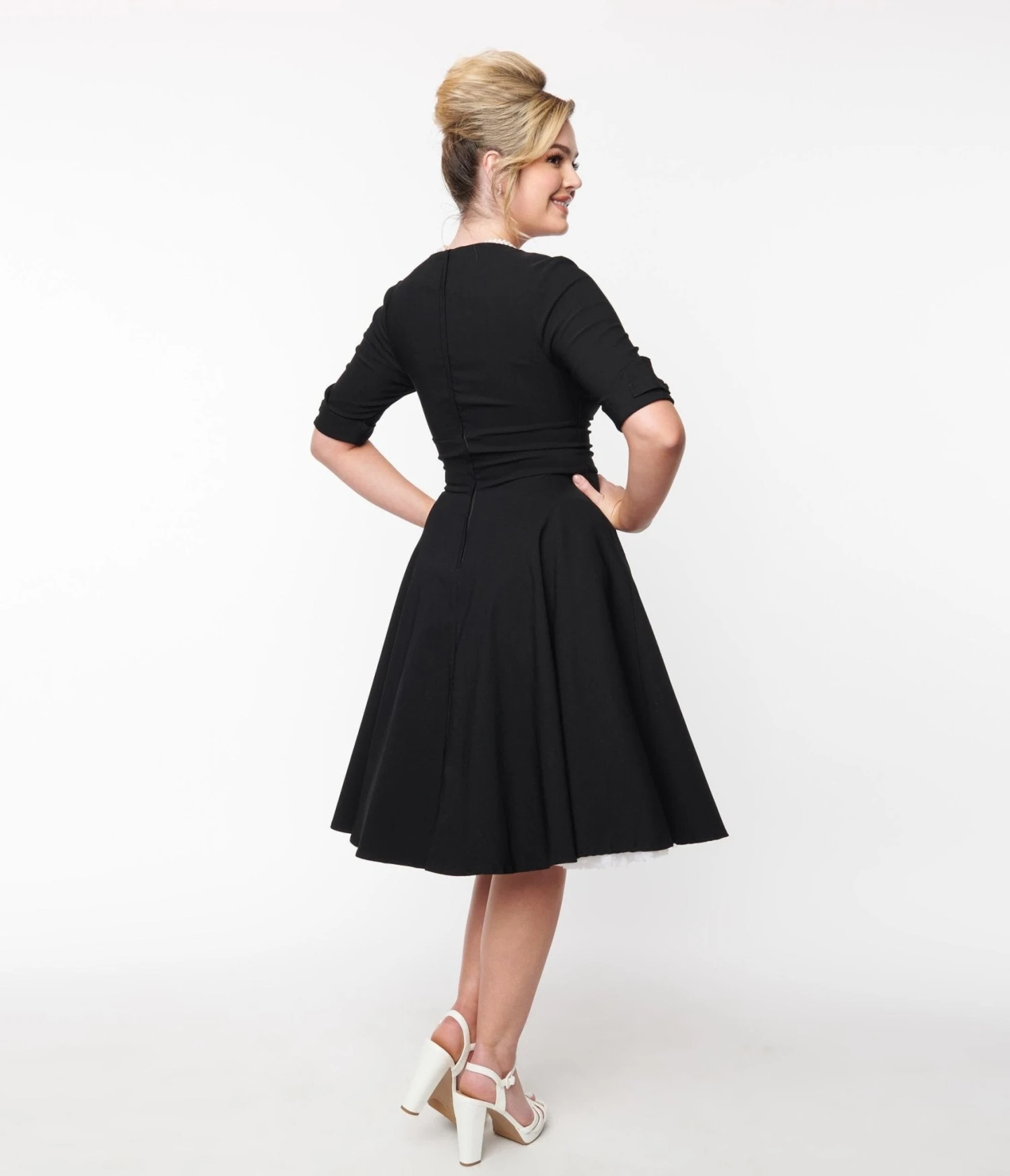 Let Delores get domestic with you, darling. A bewitching black frock rich in 1950s vintage dress appeal fresh from Unique Vintage, Delores is the flattering fit-and-flare dress you’ve been dreaming of! Boasting a gathered surplice V-neckline, trim and tailored mid-length sleeves with darling button detail, this swing dress also features a thick banded natural waistline that creates a minimized silhouette. An ample A-line full skirt billows to just below the knee in a soft pleated style, zipping slyly up the back. Crafted in a supremely soft stretch blend in stunning retro structure, this black swing dress with sleeves forms an understated yet flattering design. Set your white dress aside and reach for this versatile vintage style in black when it’s time for date night, holiday celebrations, Kentucky derby parties or any other special occasion.