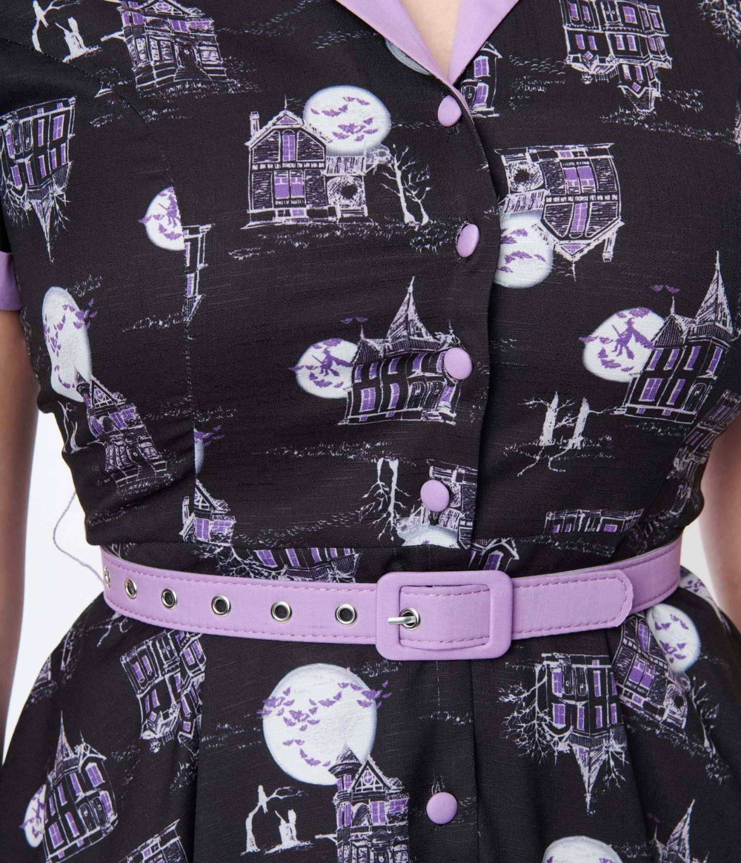 This adorable 1950s style frock features purple accents and fun haunted houses printed throughout the black lightweight woven fabric. Complete with button up front, a belt, and side pockets.