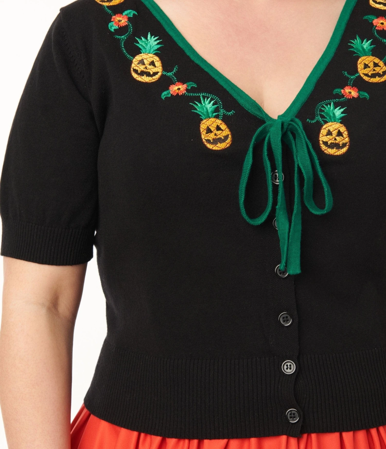 This sweet cardigan from Unique Vintage is crafted in a fabulous black knit blend and boasts a quirky June-O-Ween embroidery around the collar. The button up front leads to a classic V-neckline, centered by a sweet green self-tie bow. Complete with rib cuffed short sleeves and cropped button down hem.