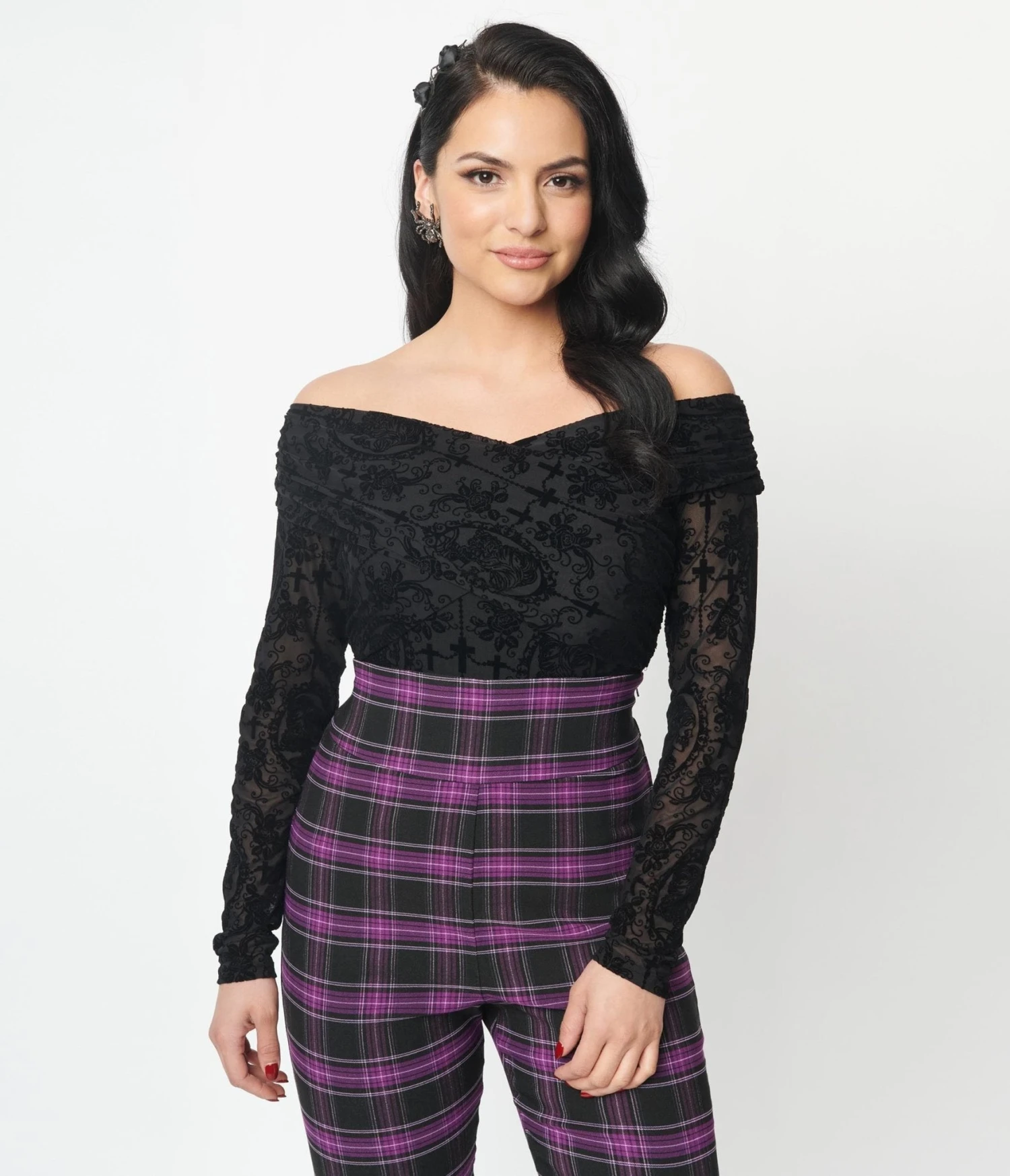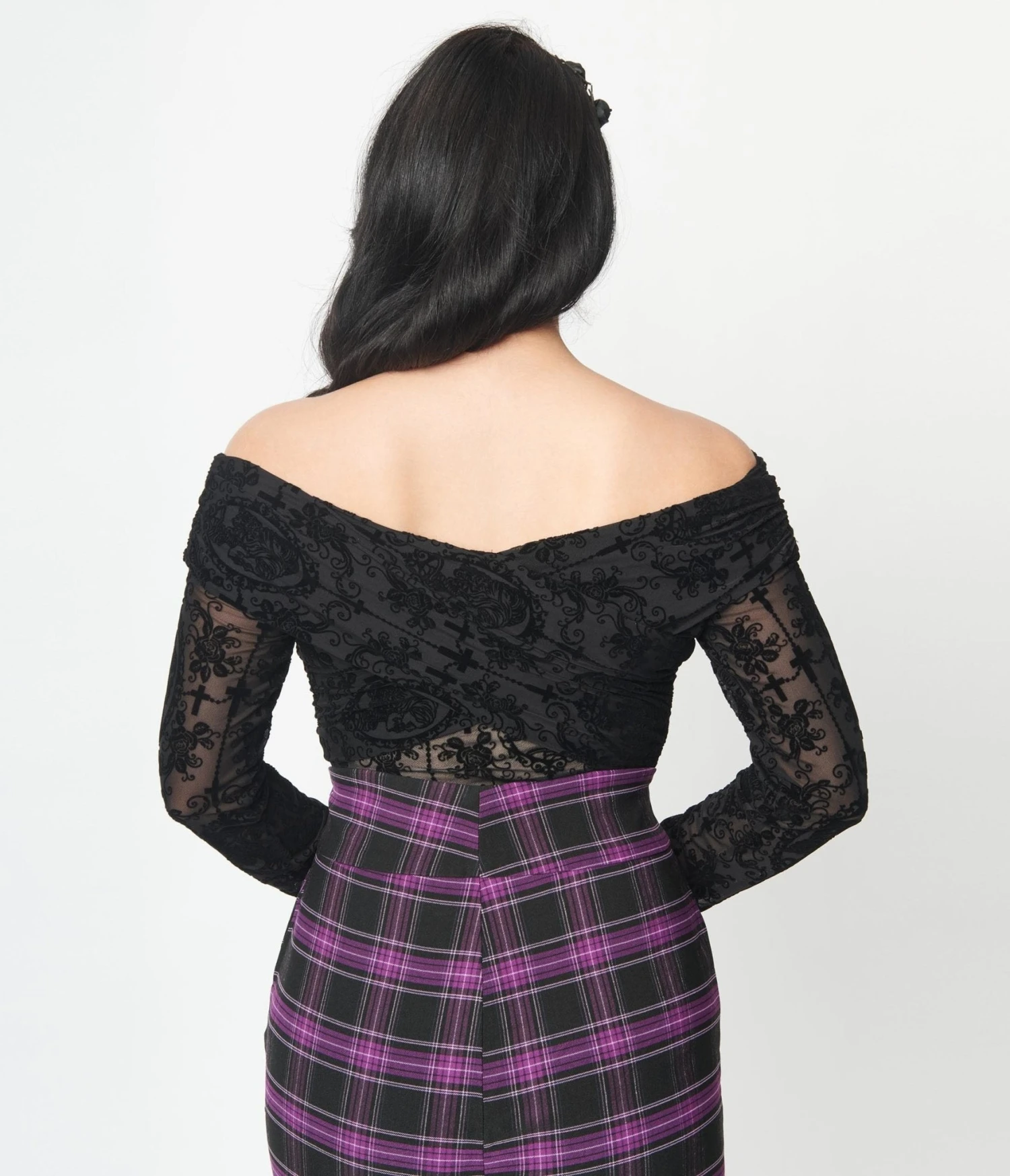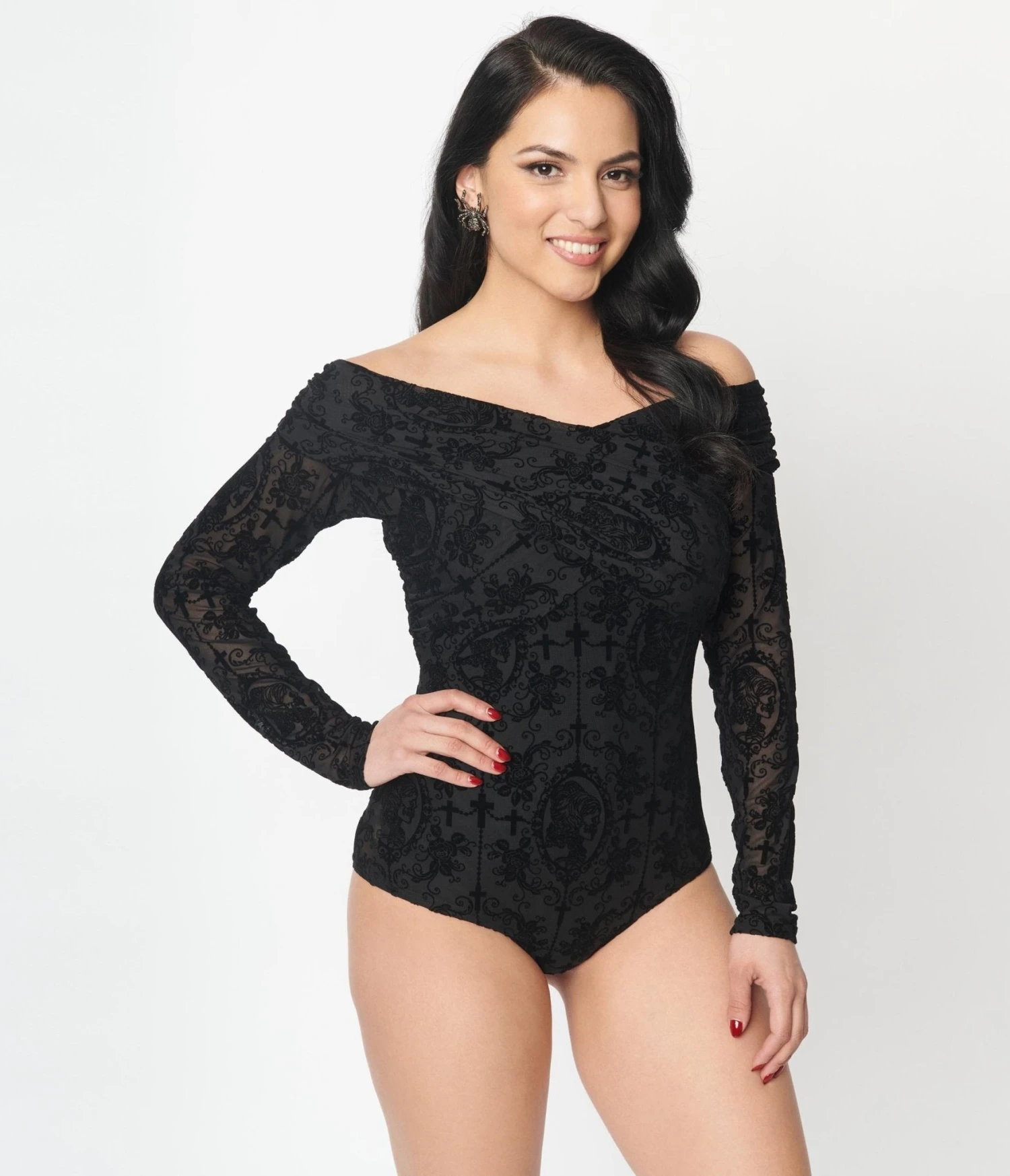 Smolder throughout the night in this alluring 1940s style bodysuit from Unique Vintage. Crafted in a fabulous black knit and mesh, dancing with the regal La Catrina throughout. The Saturday Night Bodysuit features an off the shoulder neckline and slender long sleeves while the gathered surplice neckline lends feminine flair. Complete with a dual snap button closure for easy pairing with your favorite skirt or skinnies!