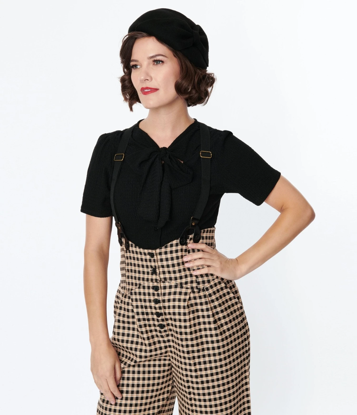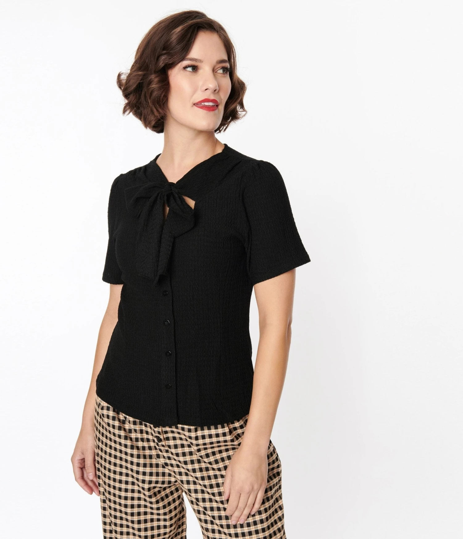 This divine 1950’s inspired blouse is crafted in a black knit and outfitted with attached self tie neck bow, a button up front, and framed with short sleeves.