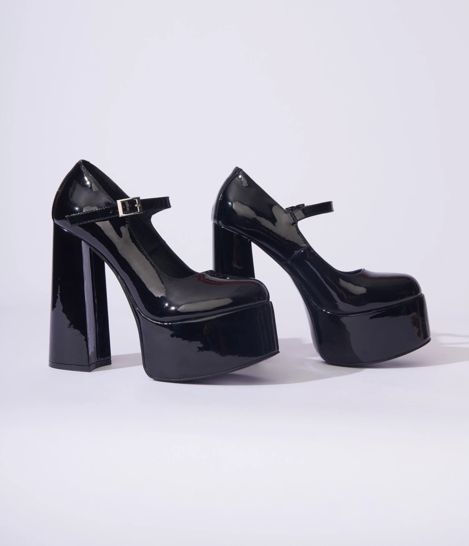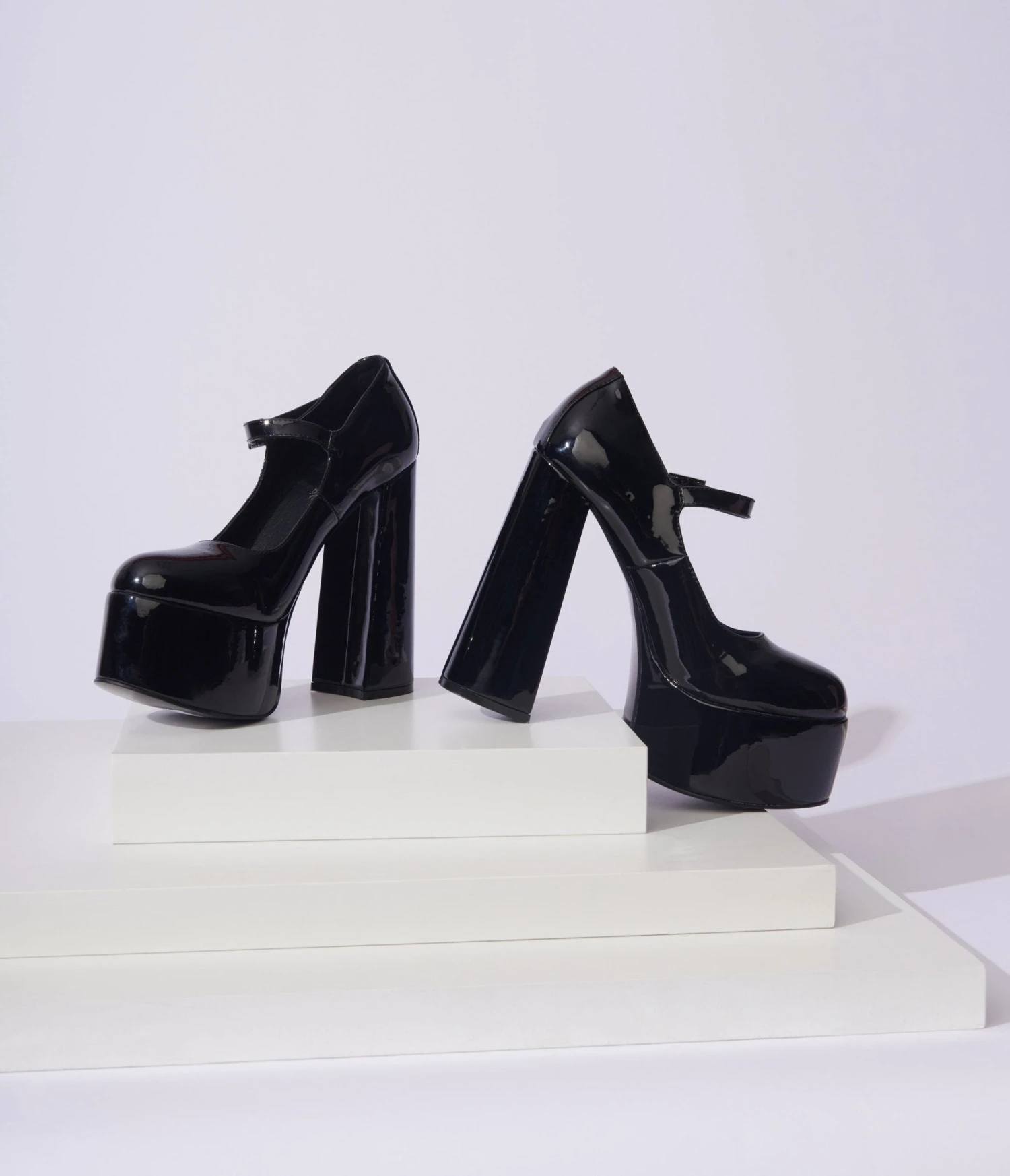 Walk with confidence in these show-stopping platform Mary Janes from Unique Vintage. This pair of statement heels are crafted in a black patent leatherette. Complete with a 2 inch platform, 6 inch heel, and an adjustable buckle.