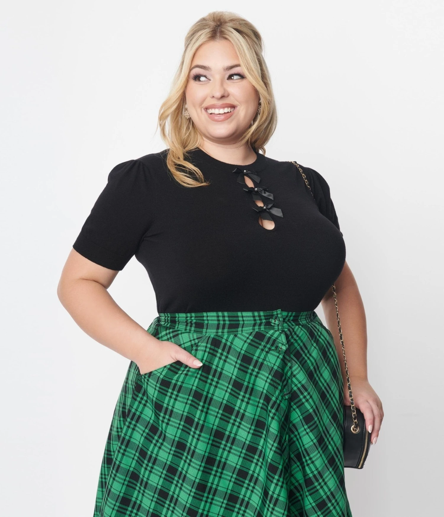 This superb 1950s style sweater is a darling separate cast in a soft black knit. The classic scoop neckline boasts a modern touch with the triple keyhole cutout front accented with adorable black satin bows. Complete with comfortable short sleeves and a straight hem.