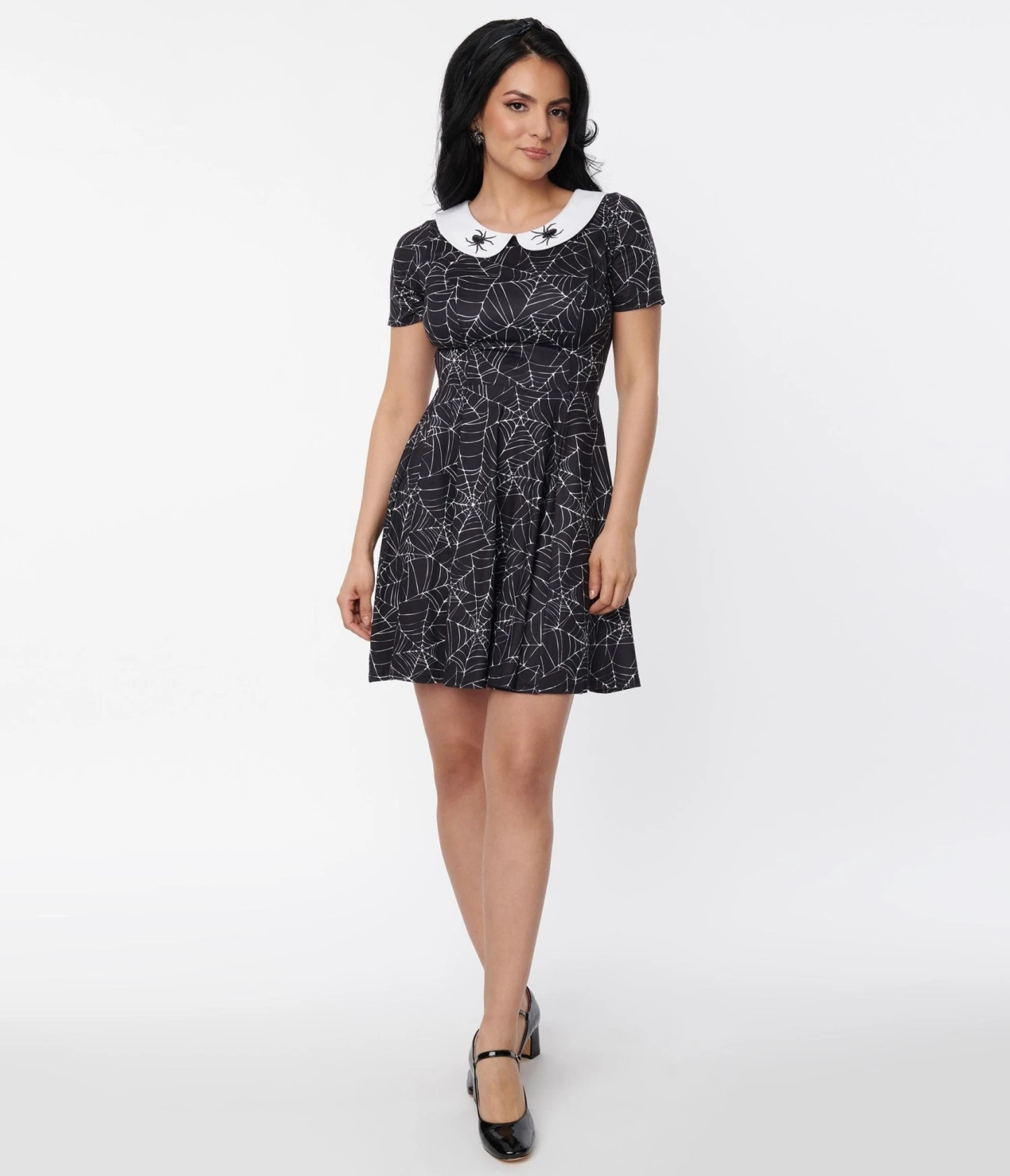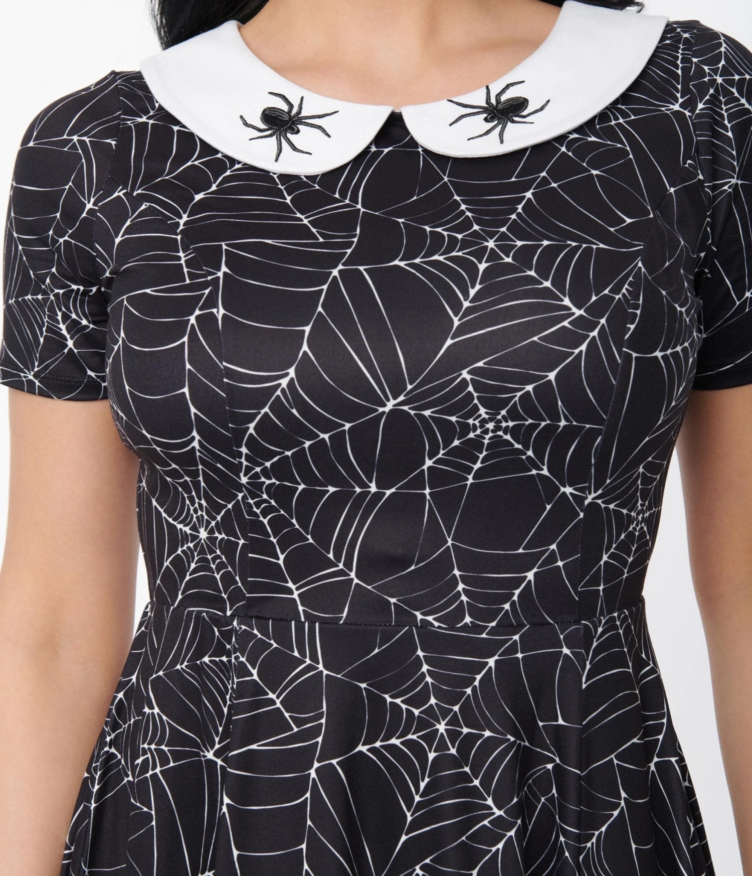 An essential 1950s style flare dress crafted in a soft stretch blend, the creepily cute white spiderwebs dance throughout the black backdrop. The seamed waist is outfitted with a back zipper and the flare skirt dances above the knees. Complete with a peter pan collar that boasts a pair of embroidered spiders for an extra spooky touch.