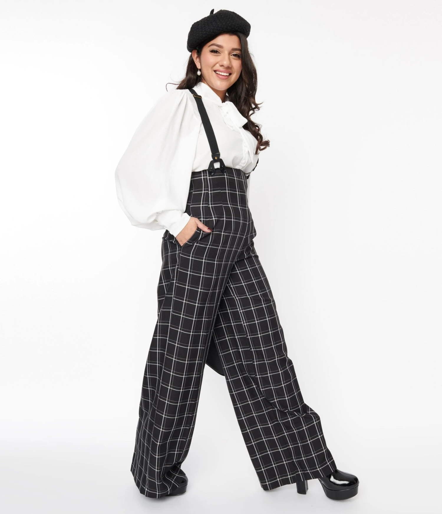 Crafted in a black windowpane plaid woven fabric, with a fabulous high waist is cinched with a back zipper while adjustable and removable suspender straps lend secure wear. The straight leg cut is outfitted with side pockets.
