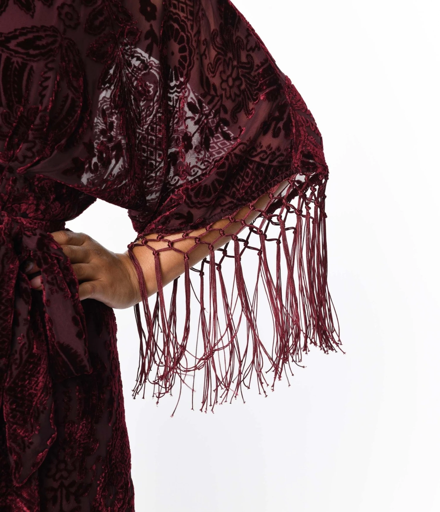 Wrap yourself in velvet, dears! This marvelous wrap dress from Unique Vintage is crafted in a gorgeous burgundy burnout that features a stunning flocked velvet floral pattern throughout. The sultry wrap design is secured with dual buttons creating a surplice neckline that is framed by dolman sleeves with attached fringe. The seamed high waist is cinched by a self tie sash while the skirt cascades to a sweeping midi silhouette!