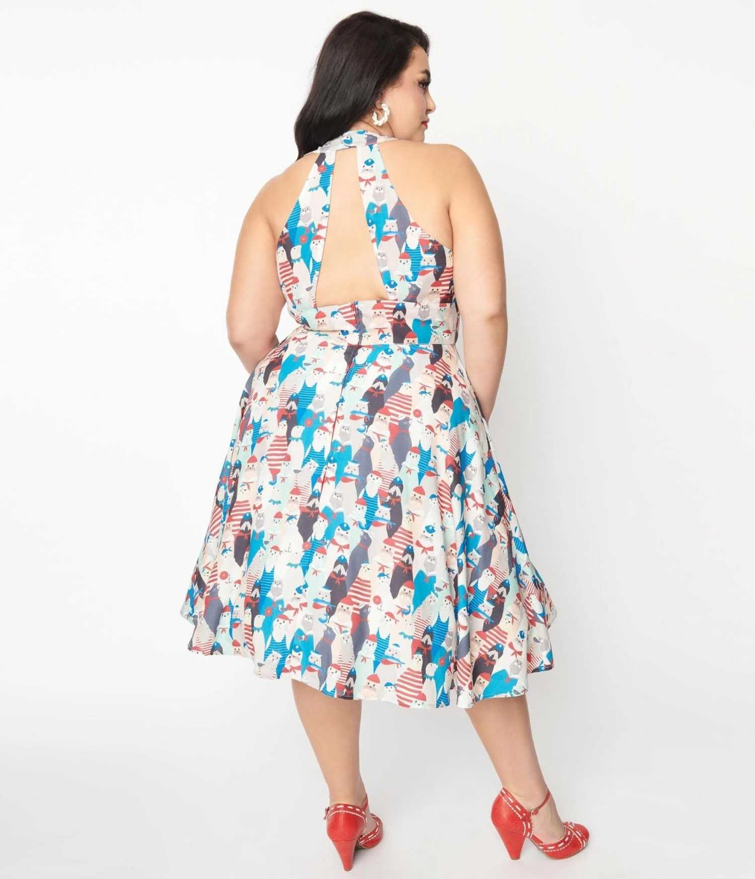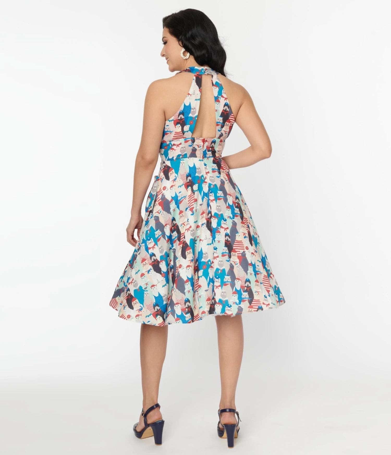 Take a trip to La Jolla! This sweet 1940s style swing dress is crafted in a woven crepe fabric that dances with joyful seals paying homage to the locals of La Jolla. The sweet halter neckline is paired with a daring cutout back. Complete with back zipper and front patch pockets!