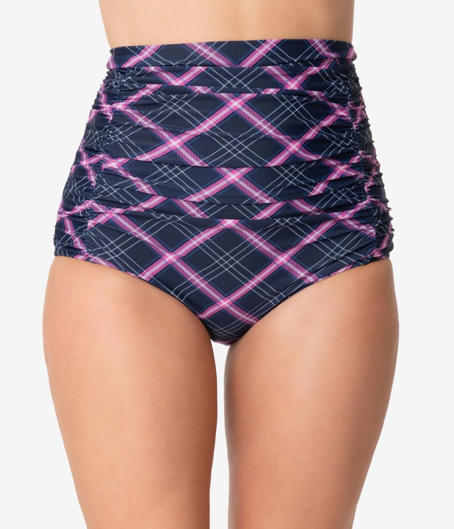 Highlight your curves, gals! The fabulous pool ready high-waisted swim bottoms from Unique Vintage are a true retro classic, perfectly versatile to pair with a matching swim top or a different color altogether. The Monroe Swim Bottoms are cast in a stunning pink plaid print through a navy blue backdrop and feature a marvelous high waist for an undeniably flattering silhouette in a comfortable, high quality material with slimming ruching throughout the hips and a waistband that extends all the way up to the natural waist to slim the tummy, flatter your hips and add a bit of a boost in all of the right places. These full coverage bottoms even come in a wide range of sizes to suit just about any vintage-loving gal!