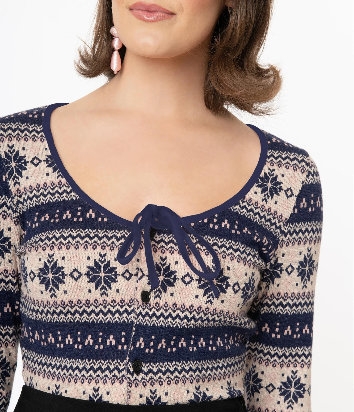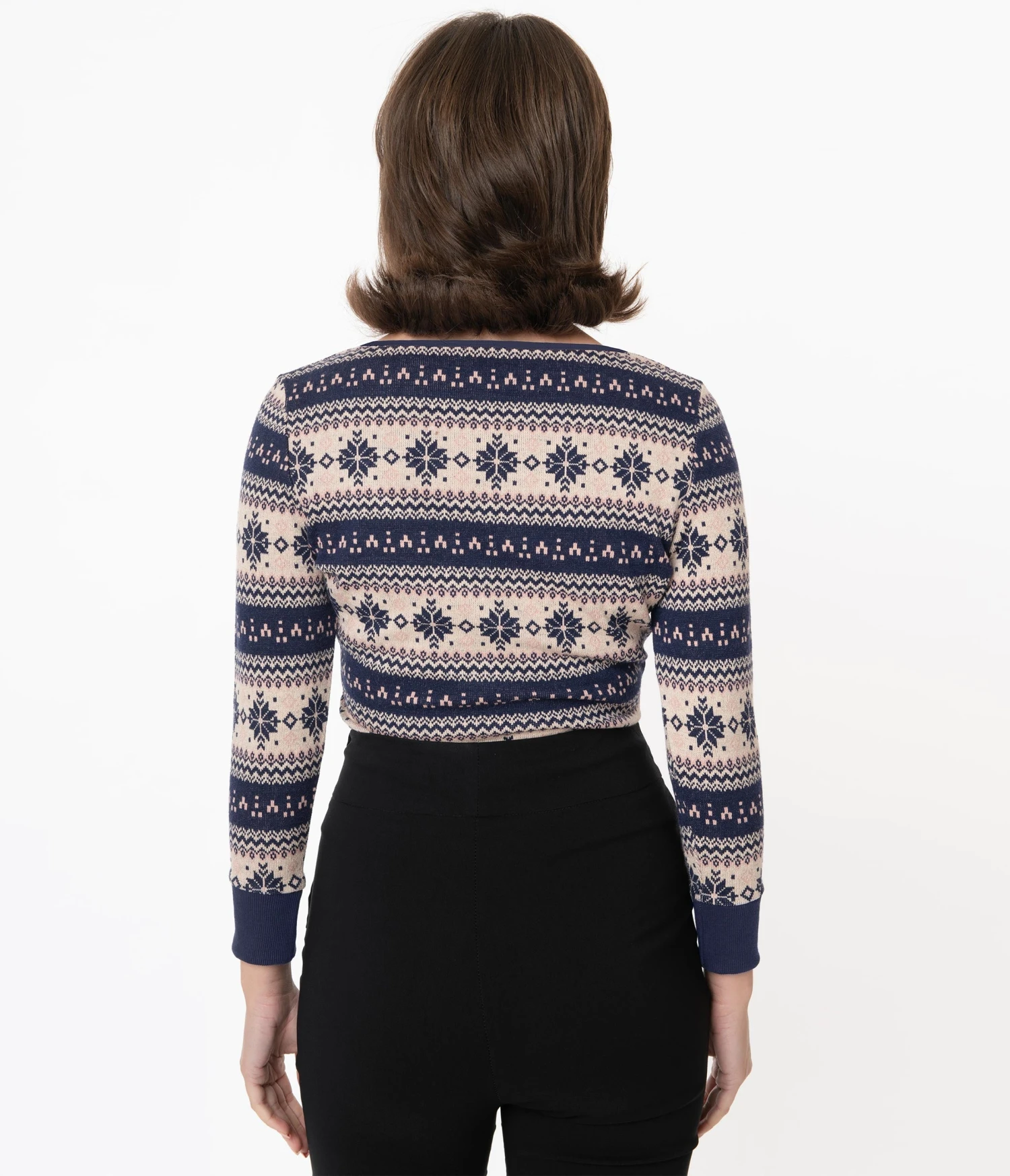 It’s all fine and dandy, darling! This sweet cardigan from Unique Vintage is crafted in a fabulous knit blend and boasts a gorgeous fair isle pattern of snowflakes in a charming navy blue, beige, and pink color. The button up front leads to a classic V-neckline, centered by a sweet light pink self tie bow. The slender long sleeves drop into a ribbed cuff while the stay in place hem makes this a charming coverup!