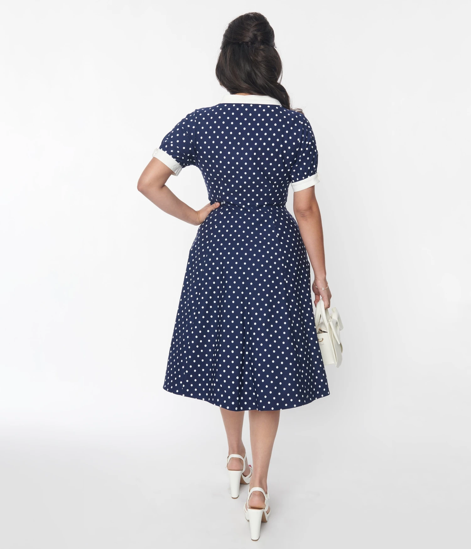 This gorgeous 1950s style swing dress is crafted in a fabulous navy stretch fabric and dances with white pin dots throughout. The asymmetrical button front is accented with contrasting white buttons and piping that leads to the solid white collar framed by short sleeves complete with button cuffs, while the swing skirt had hidden side pockets!
