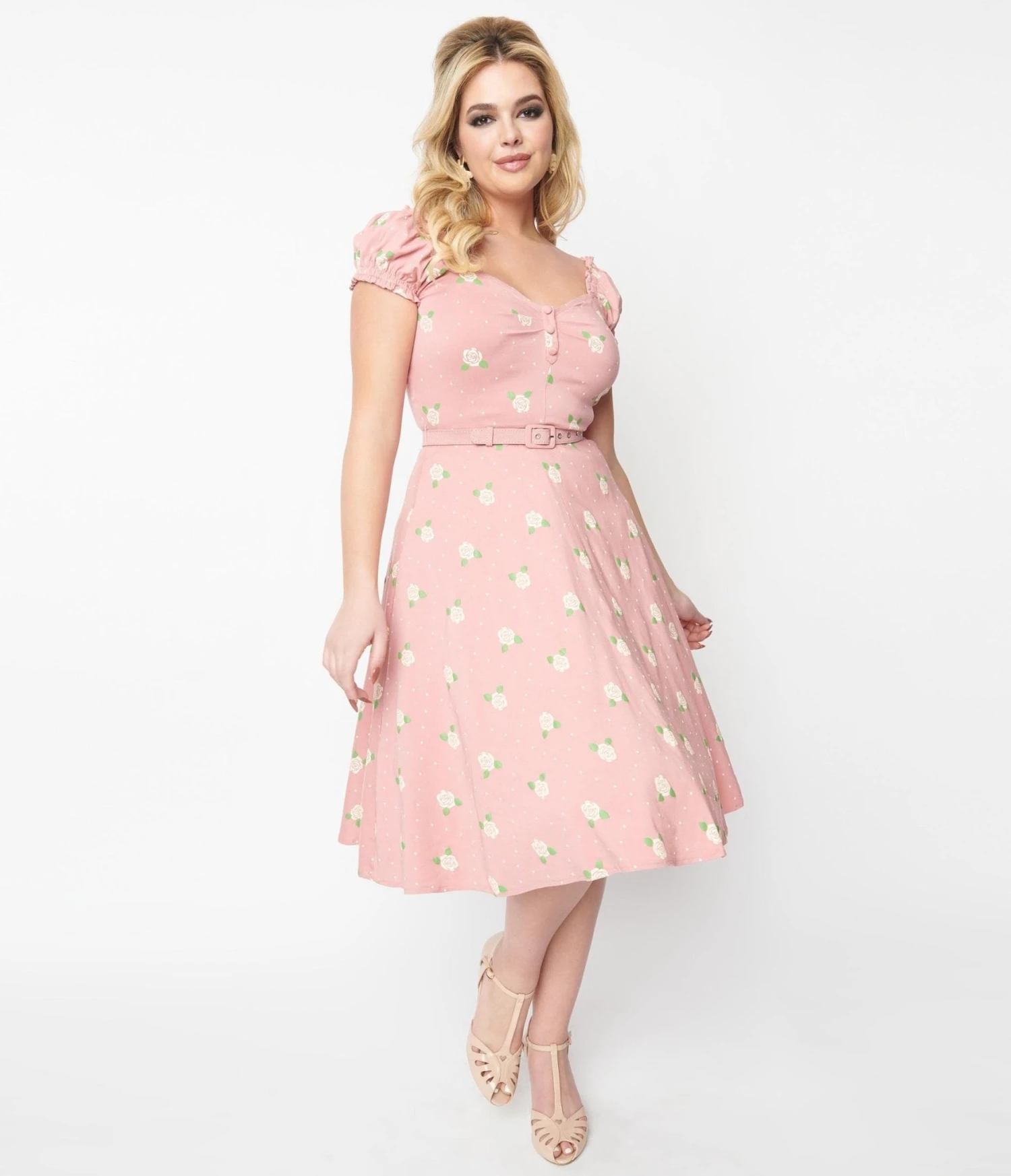 This 1960’s inspired Ohara dress from Unique Vintage is crafted in a fabulous pink stretch blend and features cream roses throughout. The heart-stopping sweetheart bodice is designed with a sultry off the shoulder neckline that dazzles with elastic bardot sleeves. The button up placket centers your form while the seamed waist is nipped in with a belt and back zipper. The sweeping swing skirt drops to your knees for fabulous vintage vibes!