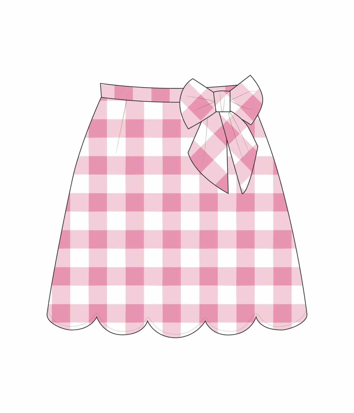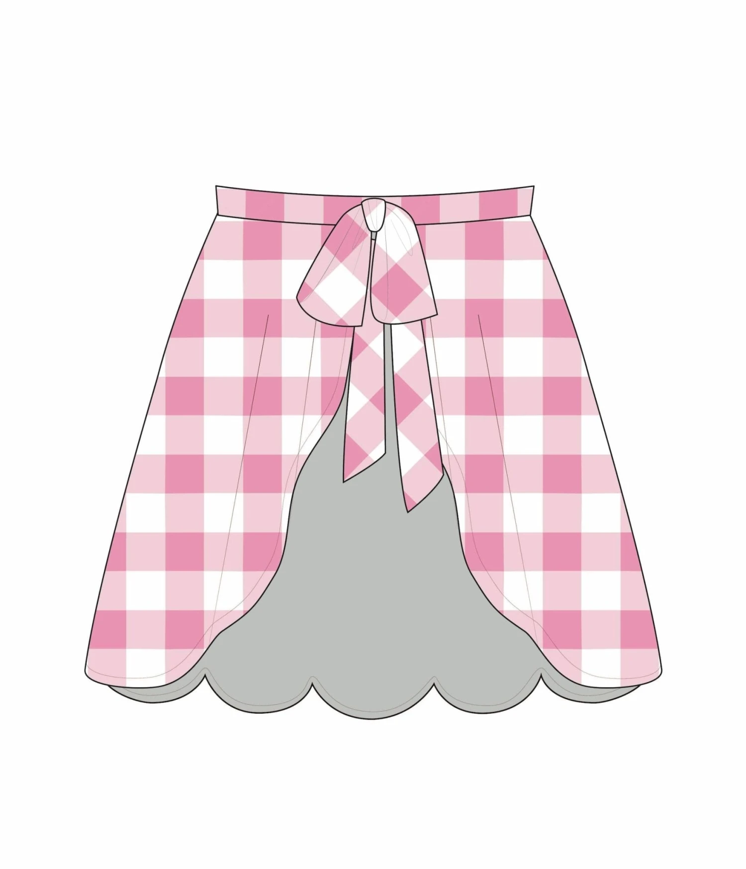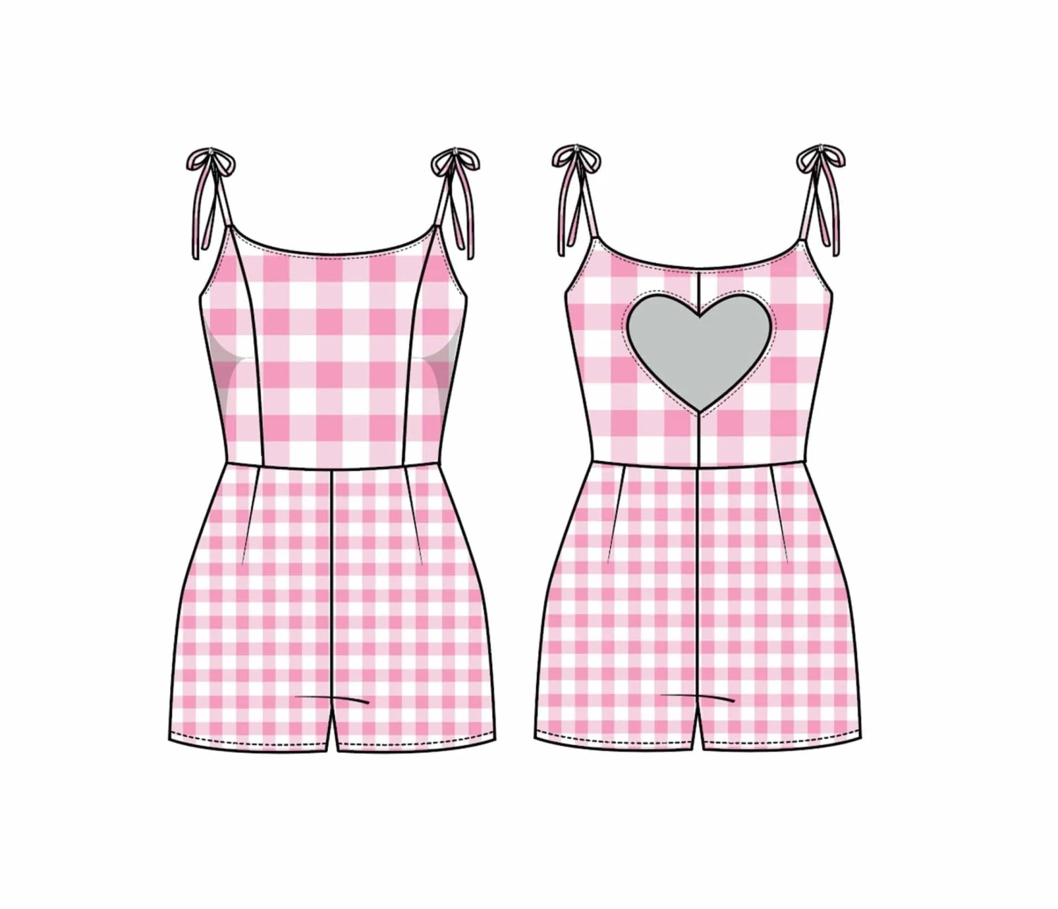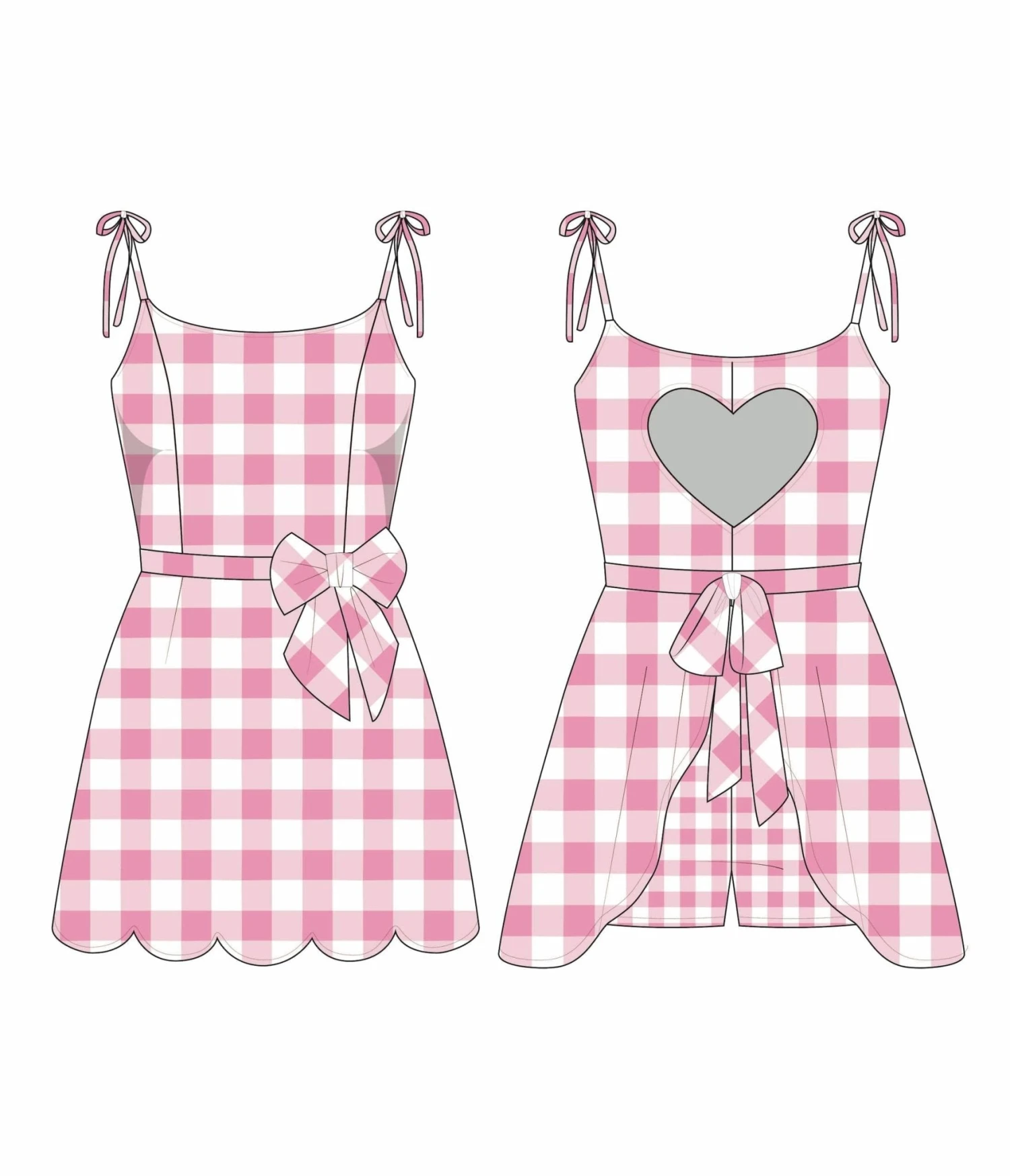 This adorable 1950s style romper and skirt set is crafted in 100% cotton poplin and cast in a sweet light pink and white gingham. The charming romper features a heart cut out on the back and self tie spaghetti straps, while the removable apron style skirt boasts a scallop hem and attached bow!