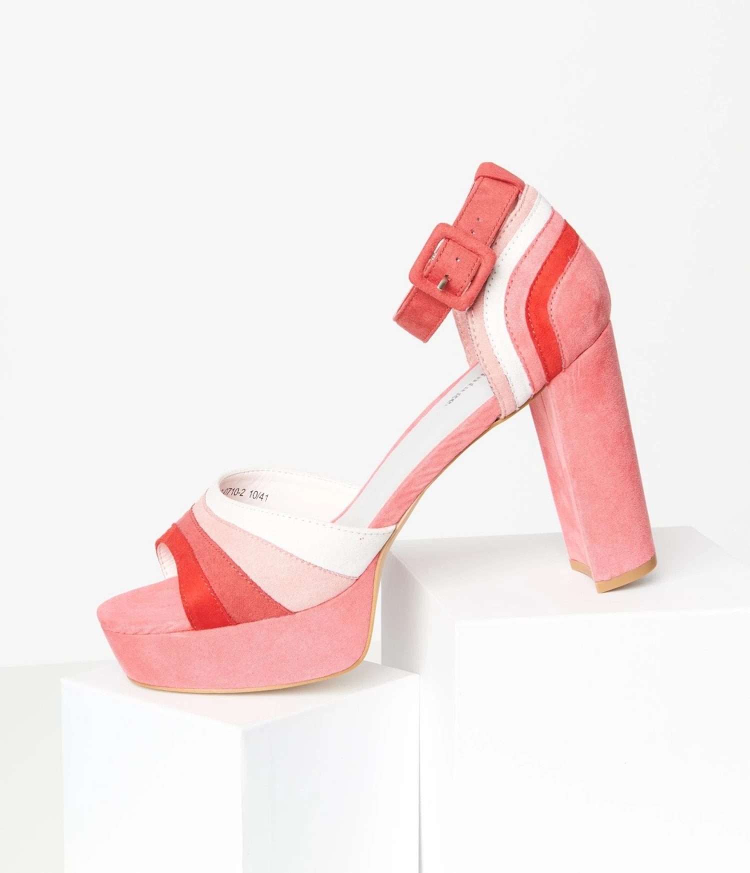 Leave a trail of broken hearts behind you, darling! Set in an overlay of pink, red, and white, these adorable pumps from Unique Vintage are crafted in faux suede to bring on some flirty vibes. These delightful kicks feature a peep toe, 4.5 inch heel, and 1.5 inch platform for a sensational lift. An adjustable ankle strap provides a secure fit with goring for movement, while the cushion insole keeps you comfortable.