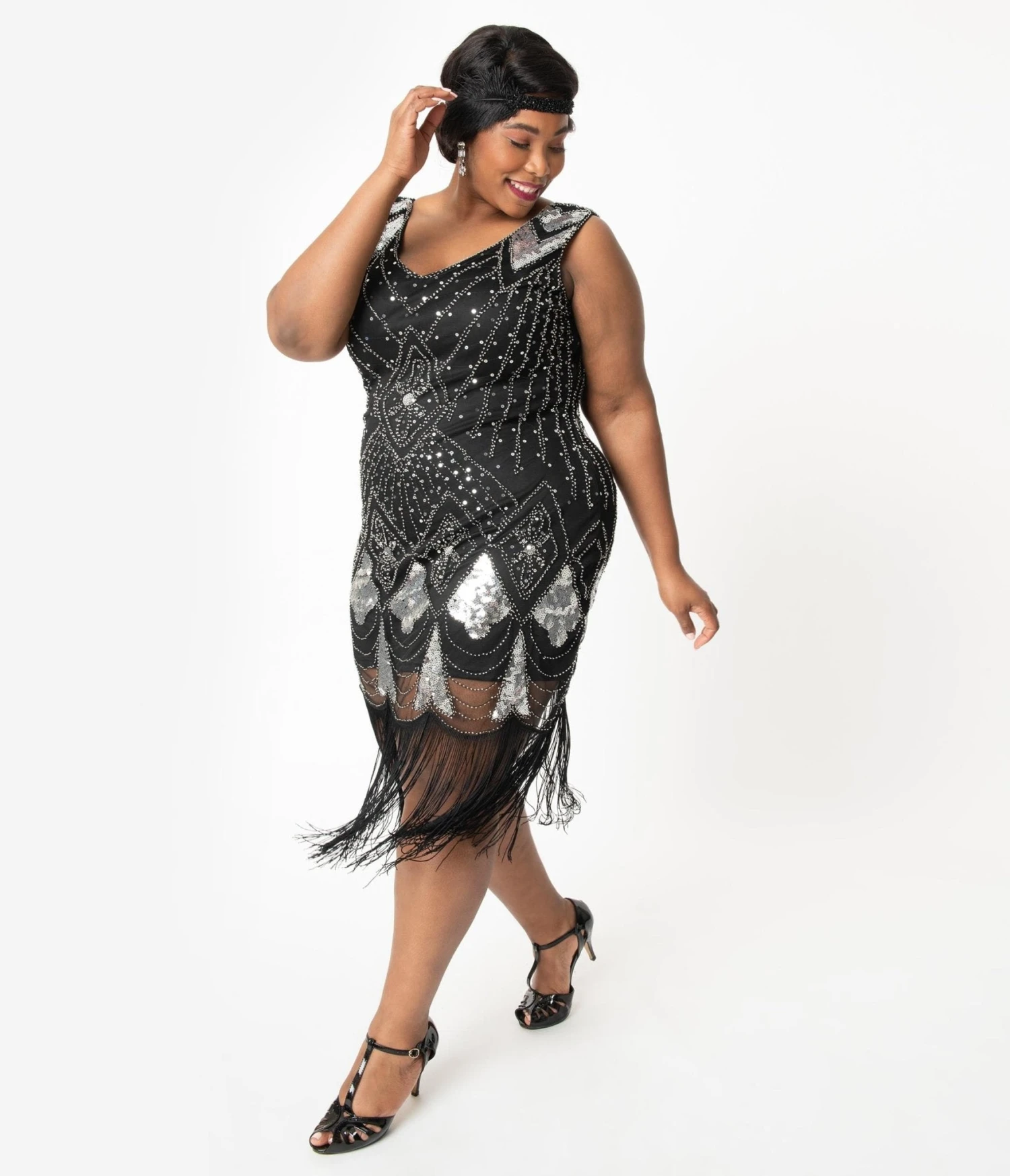 We’re ready to give our exclusive, darling! The plus size Lina Flapper is a thrilling silhouette of romance from Unique Vintage that will set their hearts to breaking. With a luscious black knit lining, a delicate black mesh overlay slims your figure while twinkling silver sequins and beading lend a dash of starlight and enchantment to your silhouette. The gentle scalloped hemline drips with long black fringe that sways past your knees while a side zipper cinches in your figure. Lina is the thief of hearts!