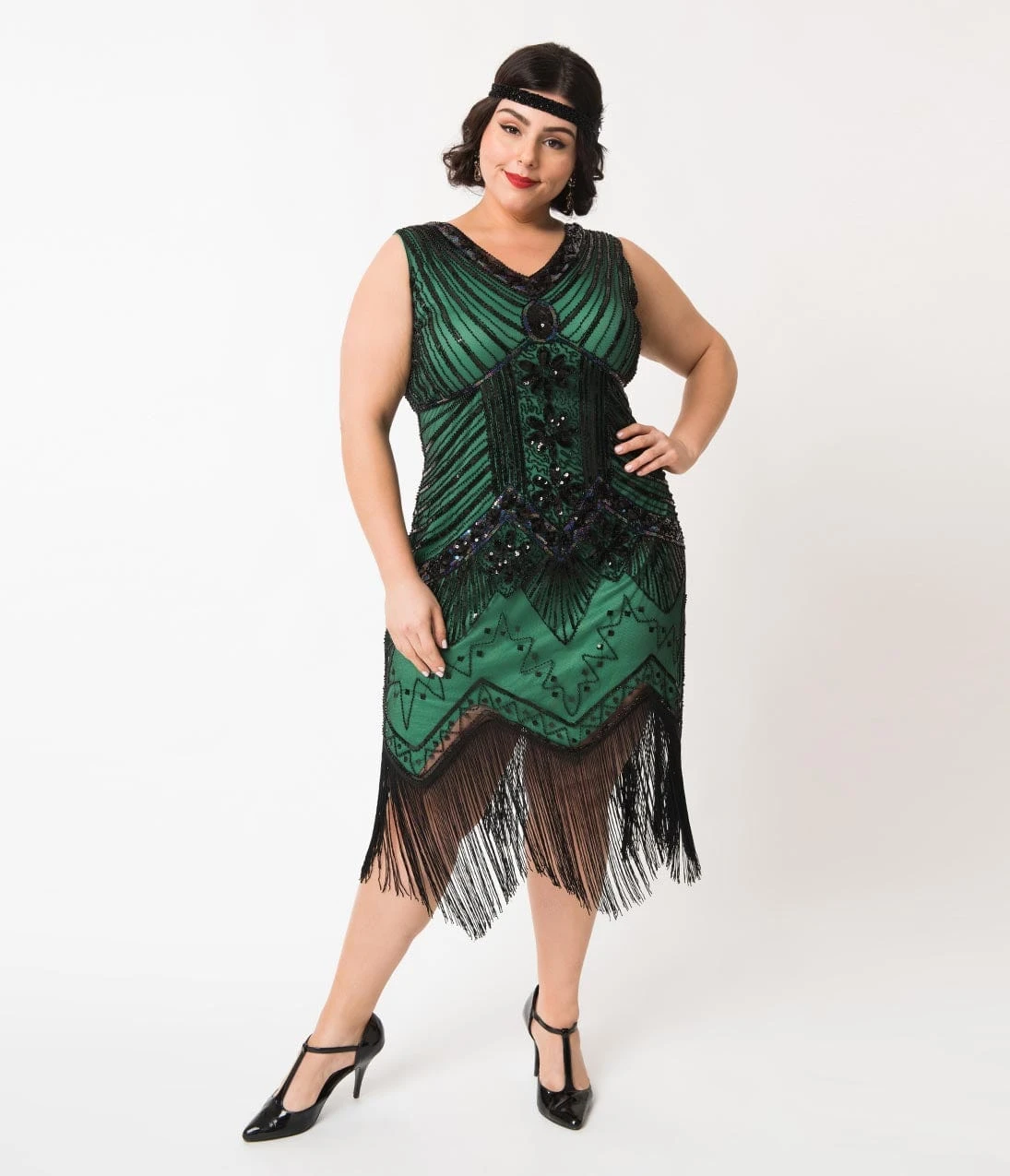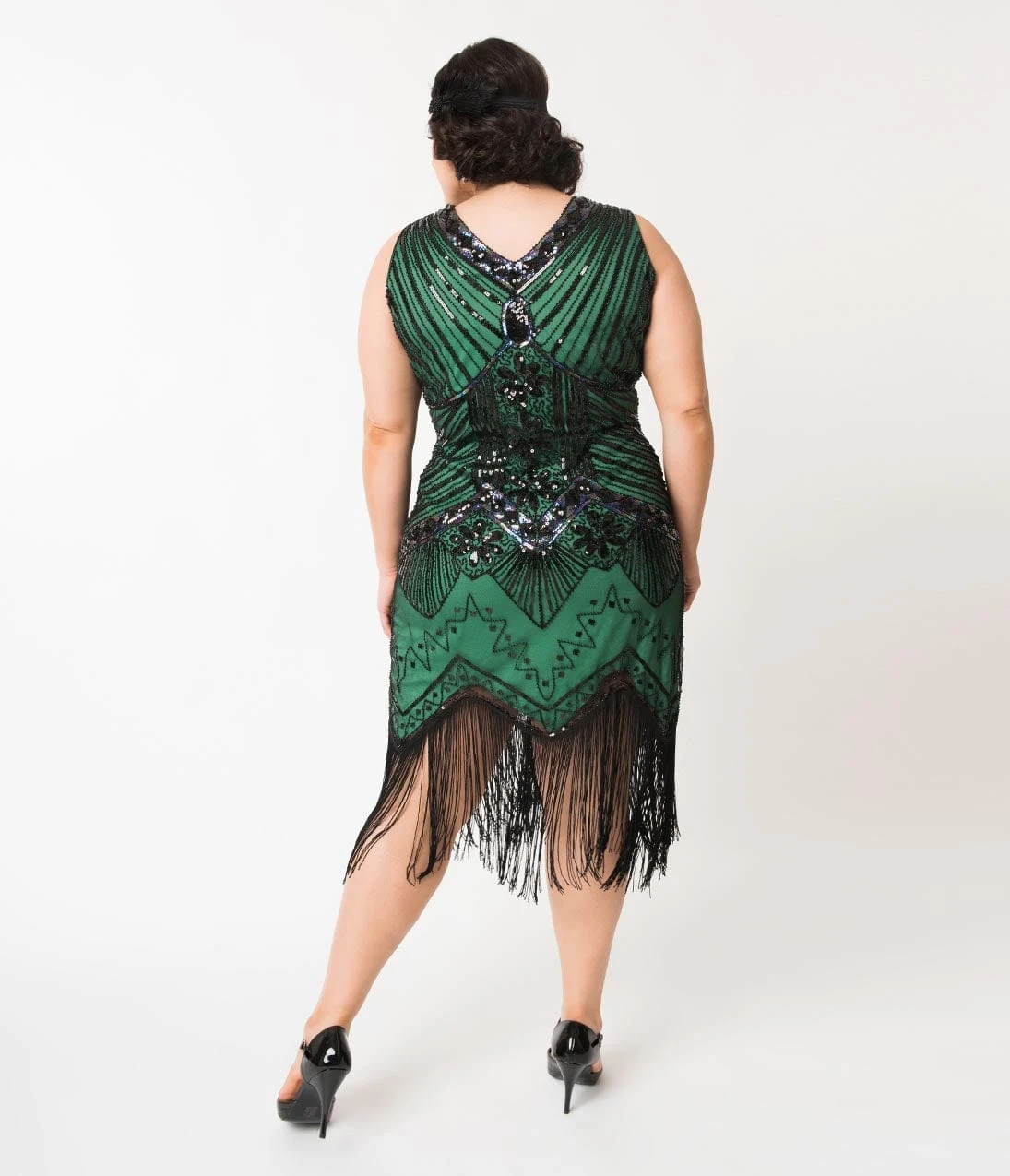 With a bit of shimmer and gleaming detail, the Veronique Flapper dress is fresh from Unique Vintage in gorgeous plus size 1920s design. Intricately deco beaded black mesh boasts black iridescent sequins and small black beads wrought in flourishing deco swirls and spirals, while emerald green knit lining creates a radiant effect. The sleeveless, v-neck design shows you off with a modest touch, while the curve hugging fit and jagged edge dripping with fringe will turn every head!