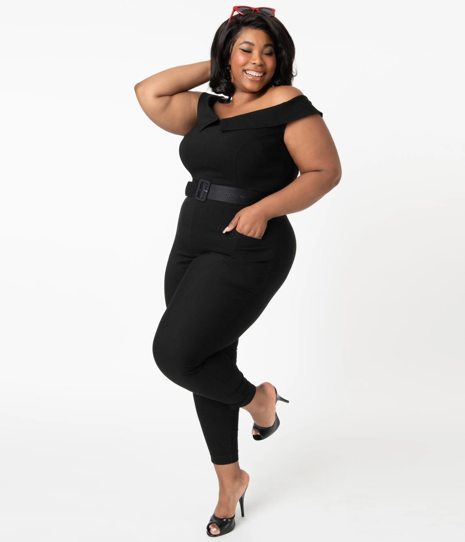 You’re no stranger to heartbreak, dears! This jaw-dropping plus size jumpsuit form Unique Vintage is a striking piece for turning over a new leaf, crafted in a marvelous black bengaline to flatter your feminine form. The Gillian Jumpsuit features a sultry off the shoulder neckline, embellished with a notched fold over accent that leads into Bardot sleeves while the seamed waist is cinched with a back zipper and wide belt. The skinny legs are outfitted with side pockets for a superior silhouette!