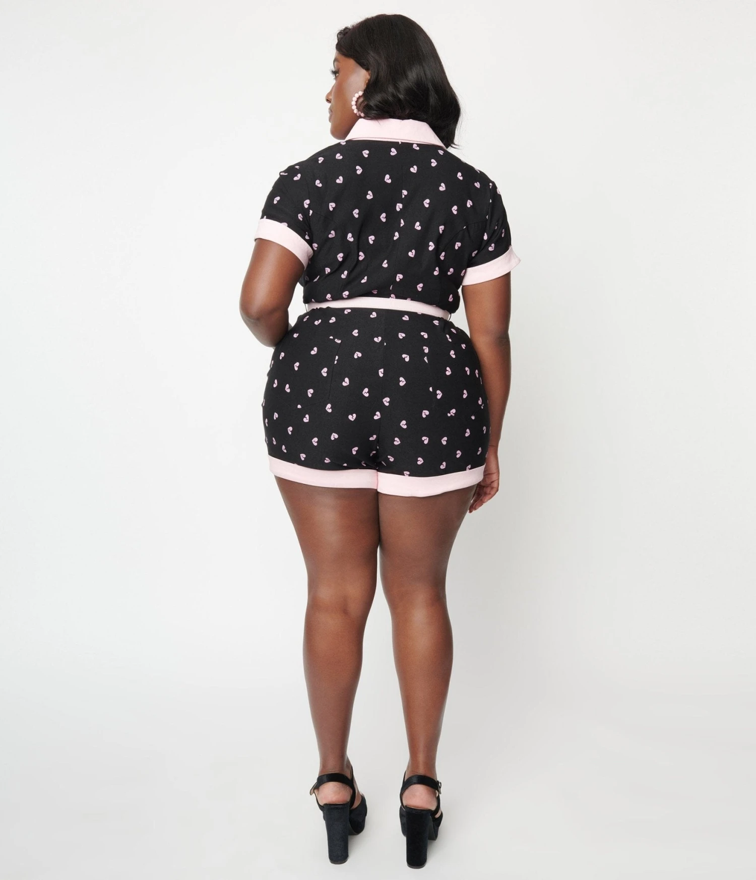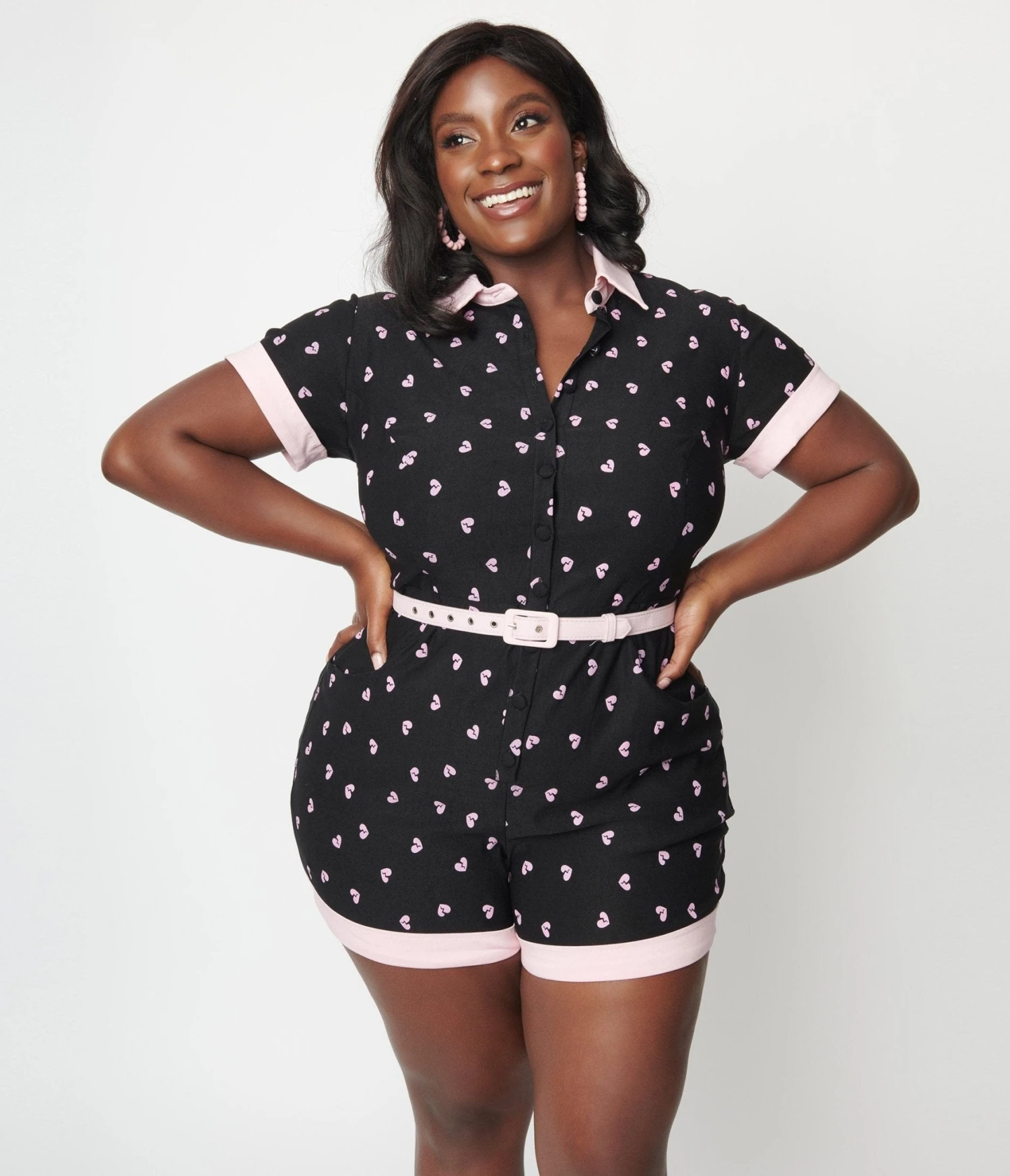 This adorable and playful plus size romper is crafted in a black bengaline that dances with pink broken hearts and outfitted with a button up front and matching belt. Complete with side and back pockets.