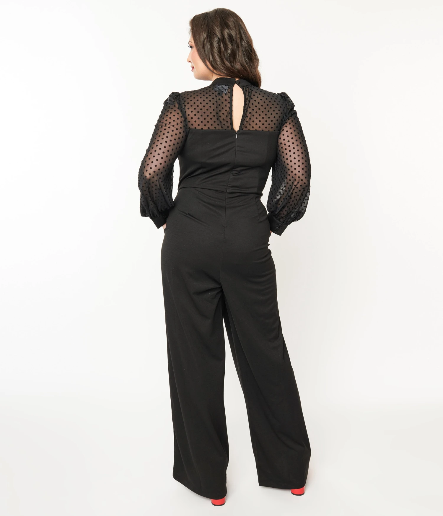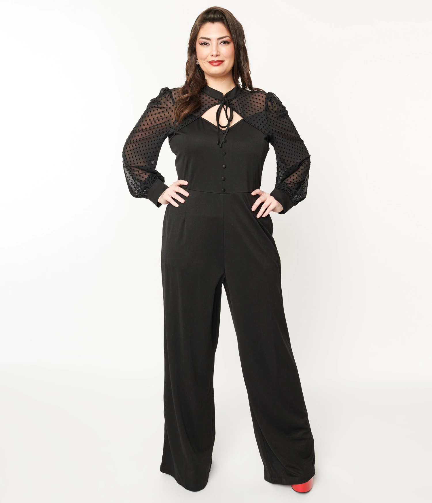 This chic and sophisticated 1970s style plus size jumpsuit features a classic black color with playful black polka dots that will surely turn heads wherever you go. The long puff sleeves add a touch of romance, while the side pockets offer both style and convenience. The faux button-down design and chest cutout create an alluring look, perfectly complemented by the neck tie and sweetheart neckline for that extra flirty touch. With a back zipper and keyhole button closure, this jumpsuit is as easy to put on as it is stylish. Complete your ensemble with confidence thanks to the adorable button cuffs that add just the right amount of charm.