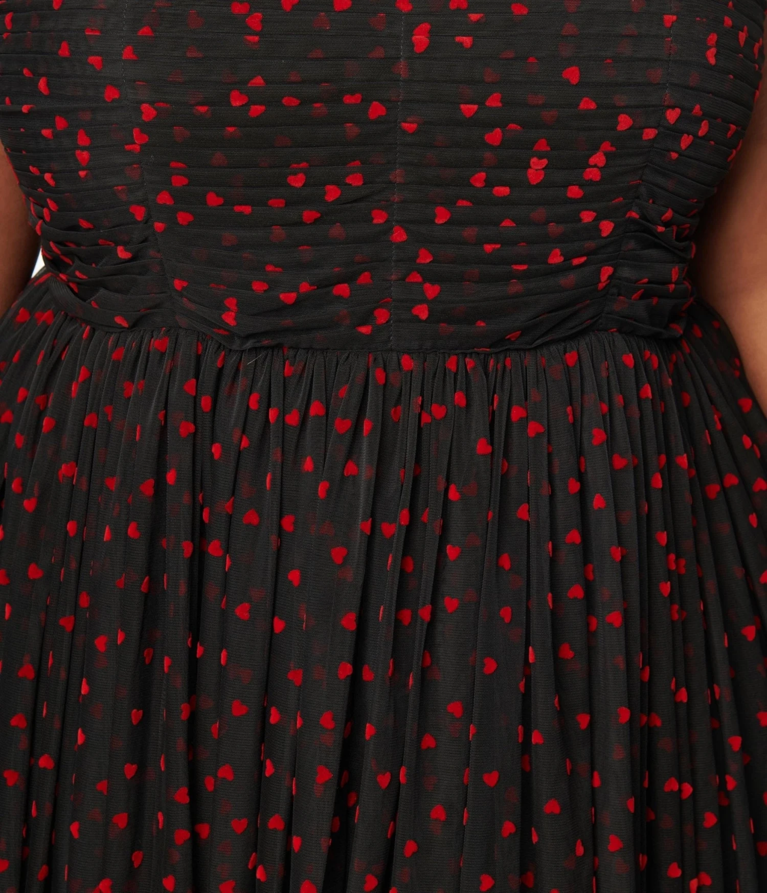 This romantic plus size swing dress is crafted in black mesh and dances with red Swiss hearts. Outfitted with built in padding, boning, and tulle layer while a back zipper completes this vintage charmer!