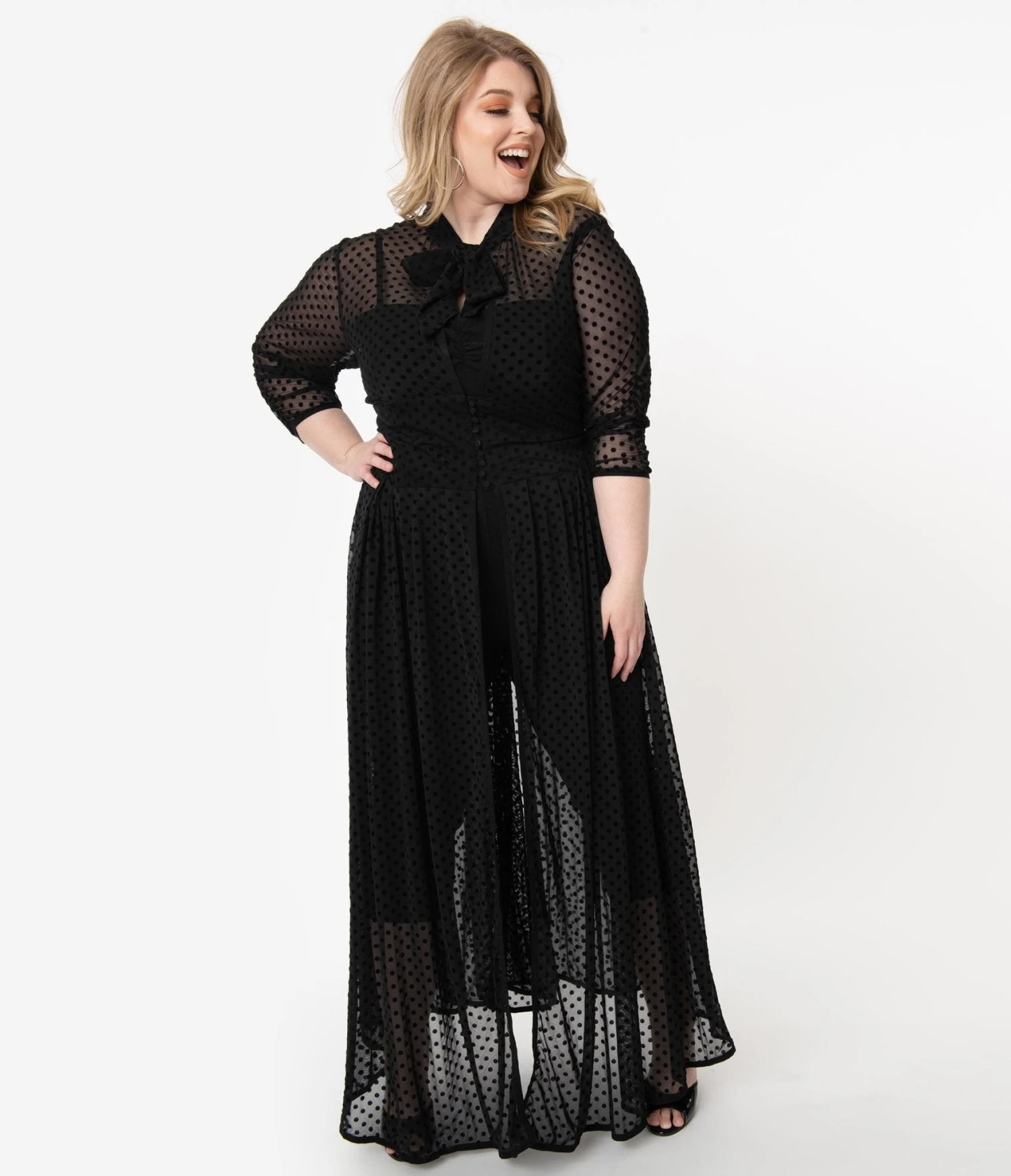 A dramatic and divine addition to your vintage wardrobe crafted in a beautiful black mesh that dances with black Swiss dots throughout, the breathtaking robe boasts a self tie neck bow and elegant three-quarter length sleeves, embellished with subtle gathers while the banded waist is nipped in with buttons. The pleated maxi skirt sweeps to the floor while the open front allows for marvelous movement. Pair with the matching jumpsuit for a jaw-dropping opening act!