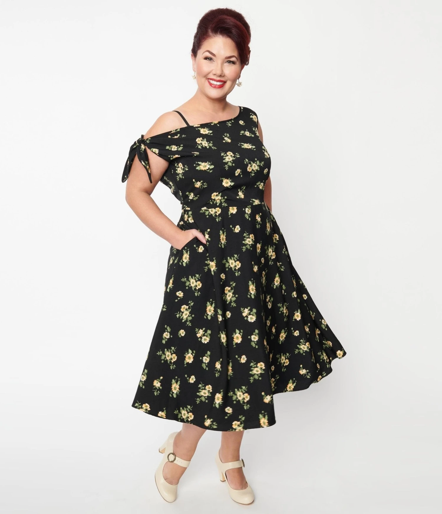 This adorable plus size swing dress is crafted in a black woven fabric that dances with yellow and white florals throughout. The bateau neckline is accented with tied straps, while the swing length skirt drops to your knees.