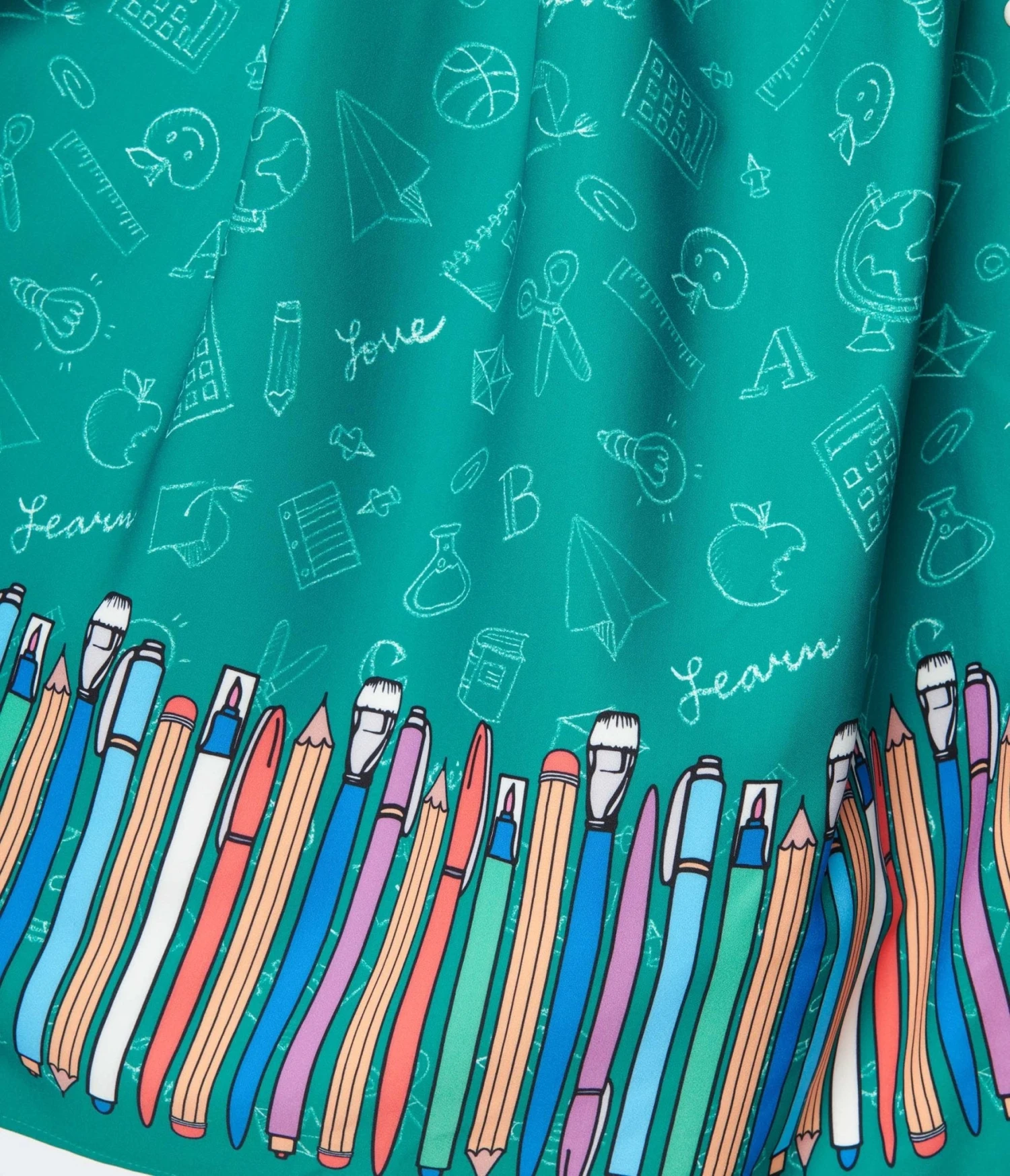 Class is in session! This adorable plus size swing dress is cast in a lightweight green woven fabric dancing with chalk doodles and boasting a colorful stationary border. Complete with a button up front, a belt, and side pockets.