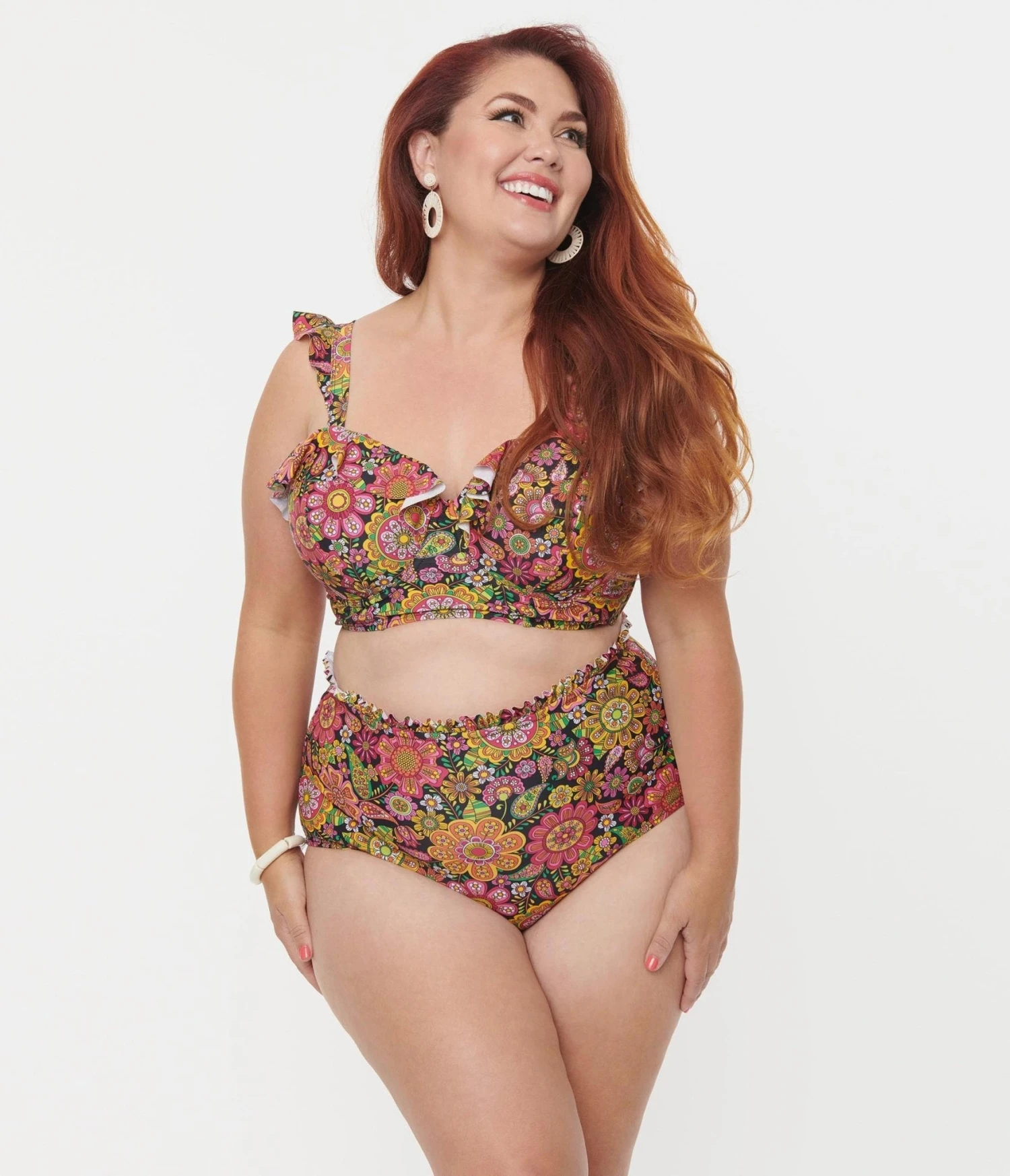 This sweet plus size swim bottom from Unique Vintage is cast in a multicolor floral print for a fabulously feminine silhouette. The lovely high waist boasts a flirtatious trim of ruffles for added retro flair while the full mesh lining keeps you flawless!