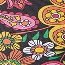 This fabulous 1970’s style plus size romper swimsuit dances with multicolor kaleidoscope florals in pink, orange, green, and yellow through a black backdrop. Outfitted with a self tie halter, sewn in padding, boy shorts, and mesh lining.