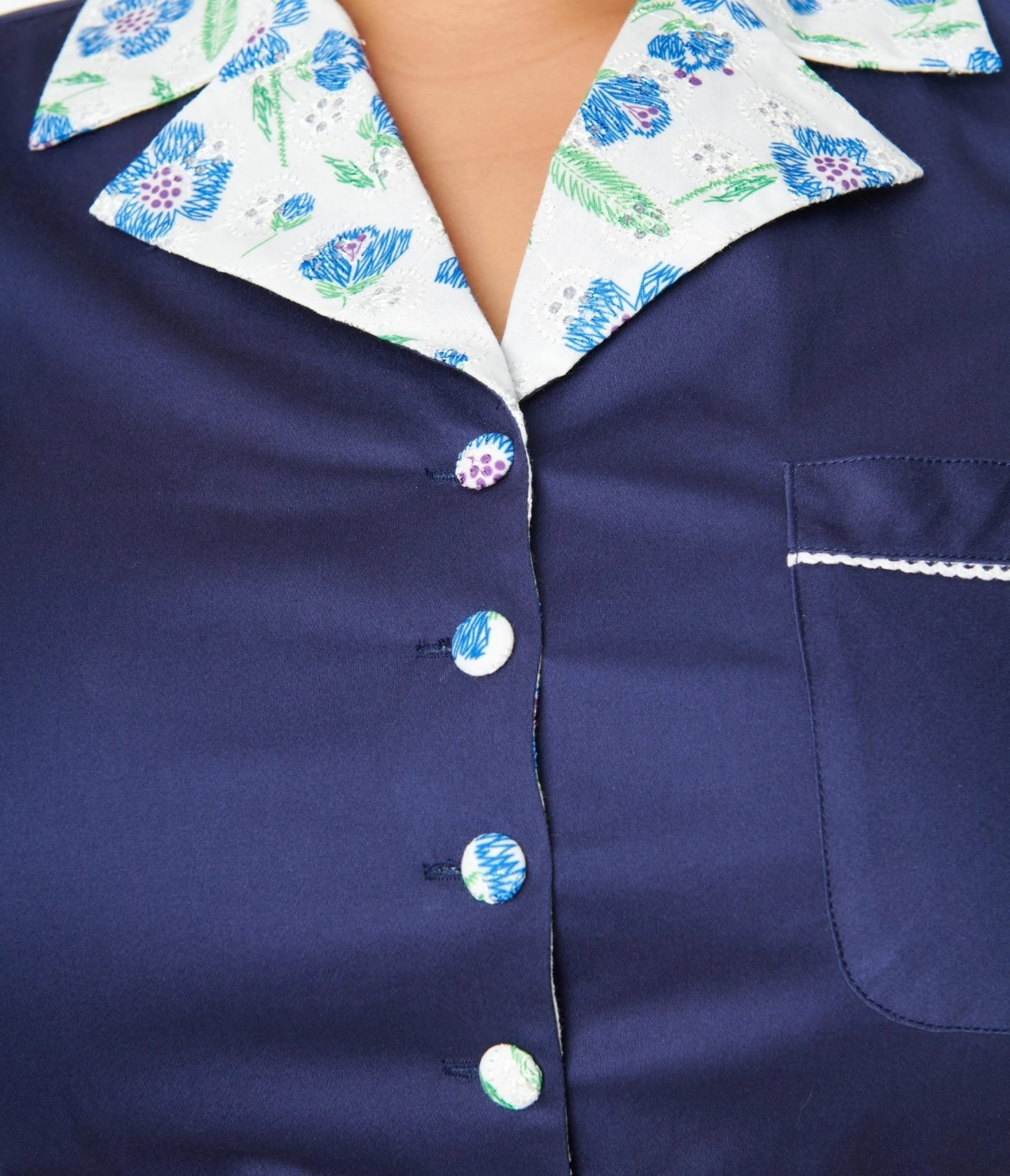 A sweet plus size silhouette crafted in a lightweight navy blue woven fabric that features a contrasting white eyelet and blue floral collar. Outfitted with a front fly zipper, button up front, and side and chest pockets.