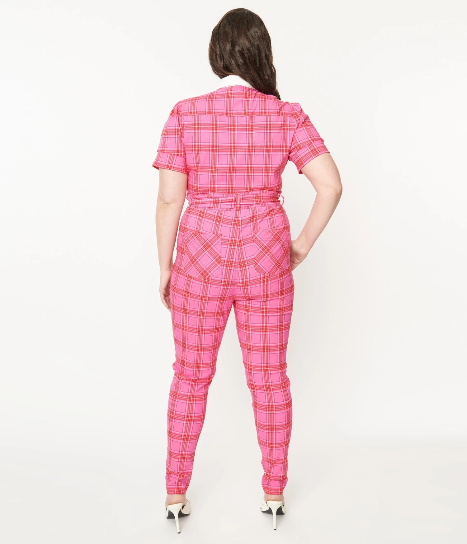This jaw-dropping plus size 1970s style jumpsuit is crafted in a sturdy stretch bengaline in a hypnotizing plaid pattern in pink and red. Outfitted with a button up bodice, front zipper, and sash. Complete with twin button chest pockets and back and side pockets.