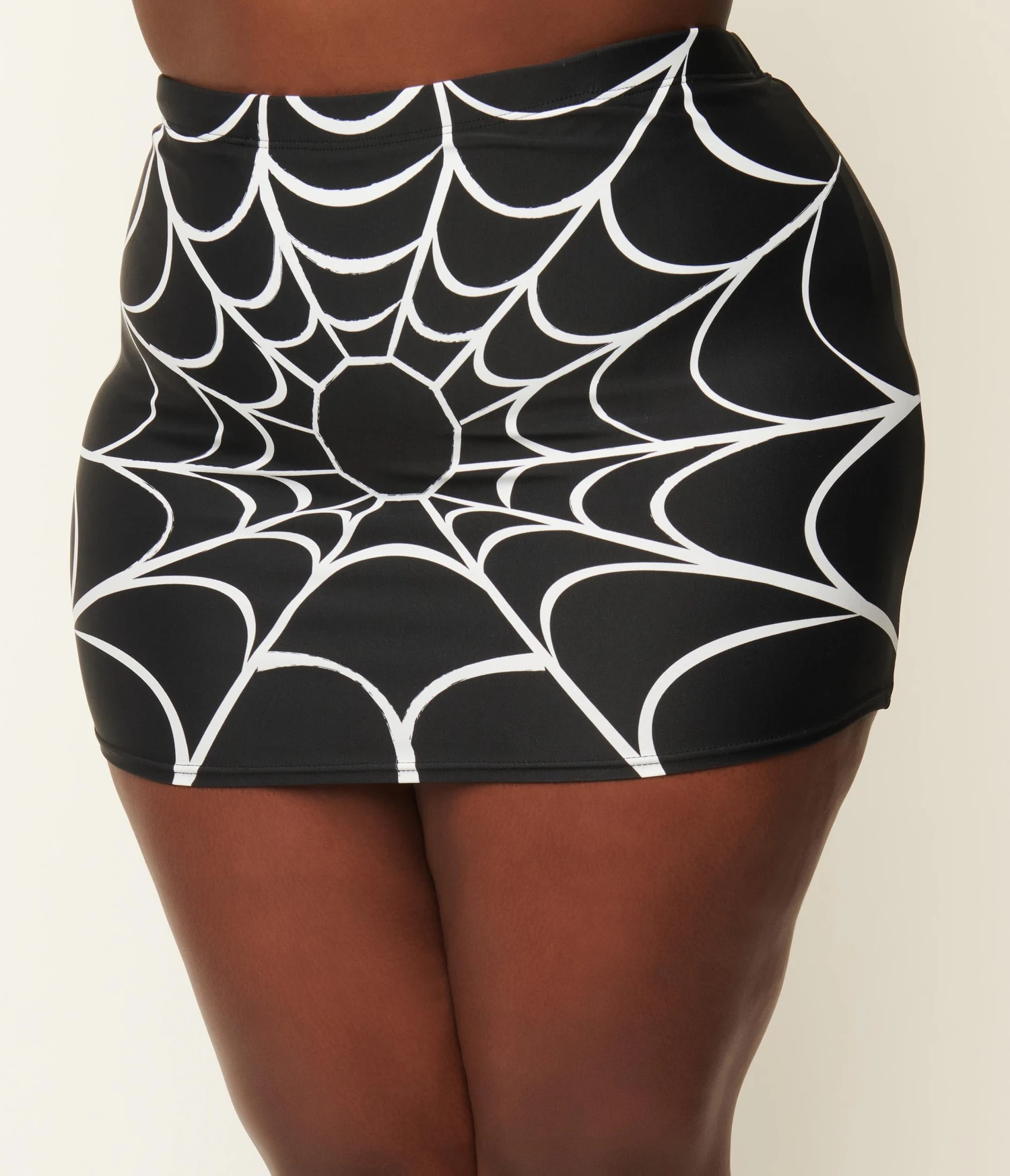 Let’s go haunt the pool, gals! Spin a new style for summer in this plus size swim skirt from Unique Vintage. The sultry black backdrop boasts a brilliant white spiderweb print throughout the high waisted silhouette. The elastic banded waist cinches to you form while the inner briefs provide comfort and coverage for thrilling pin-up posing!