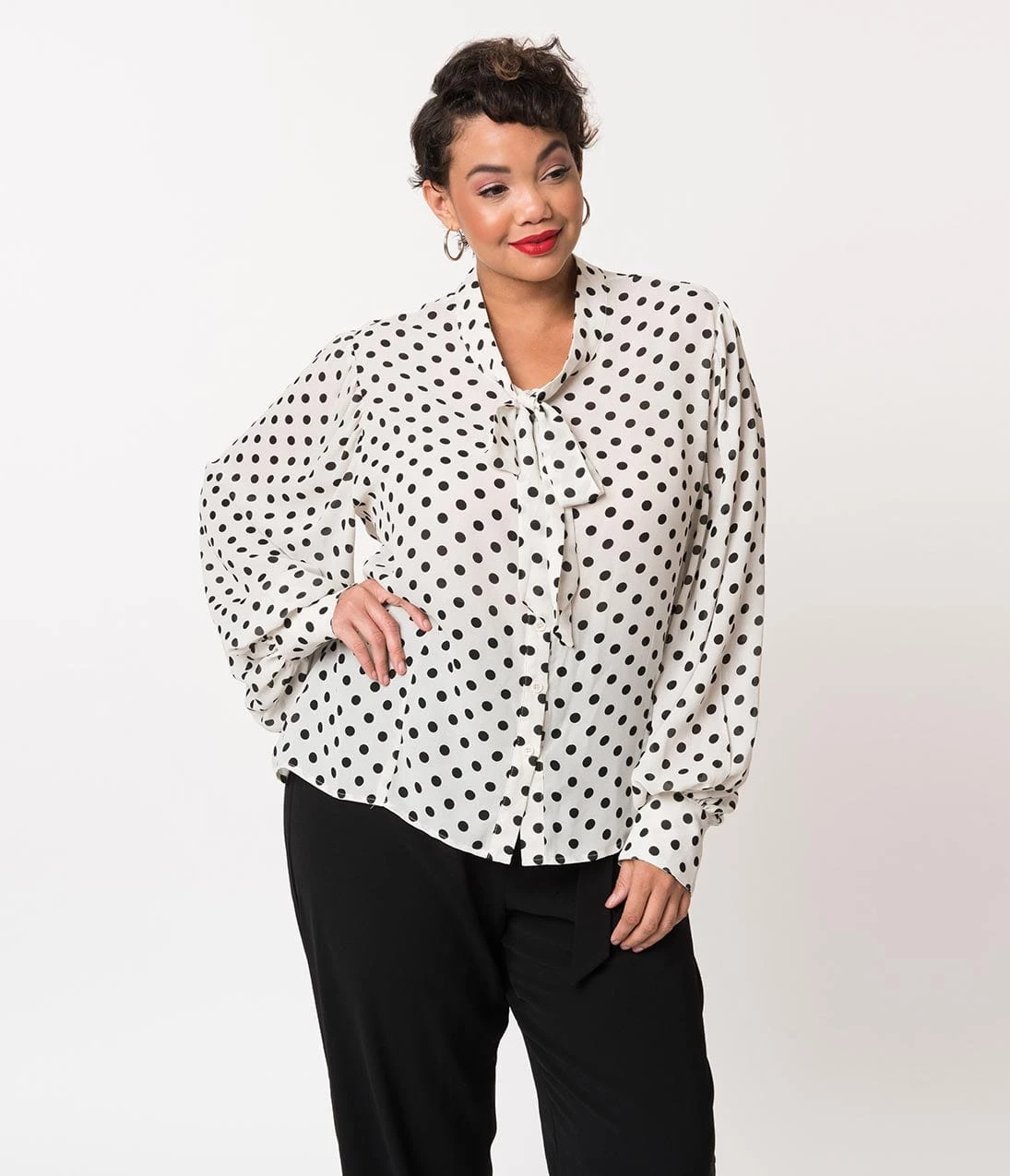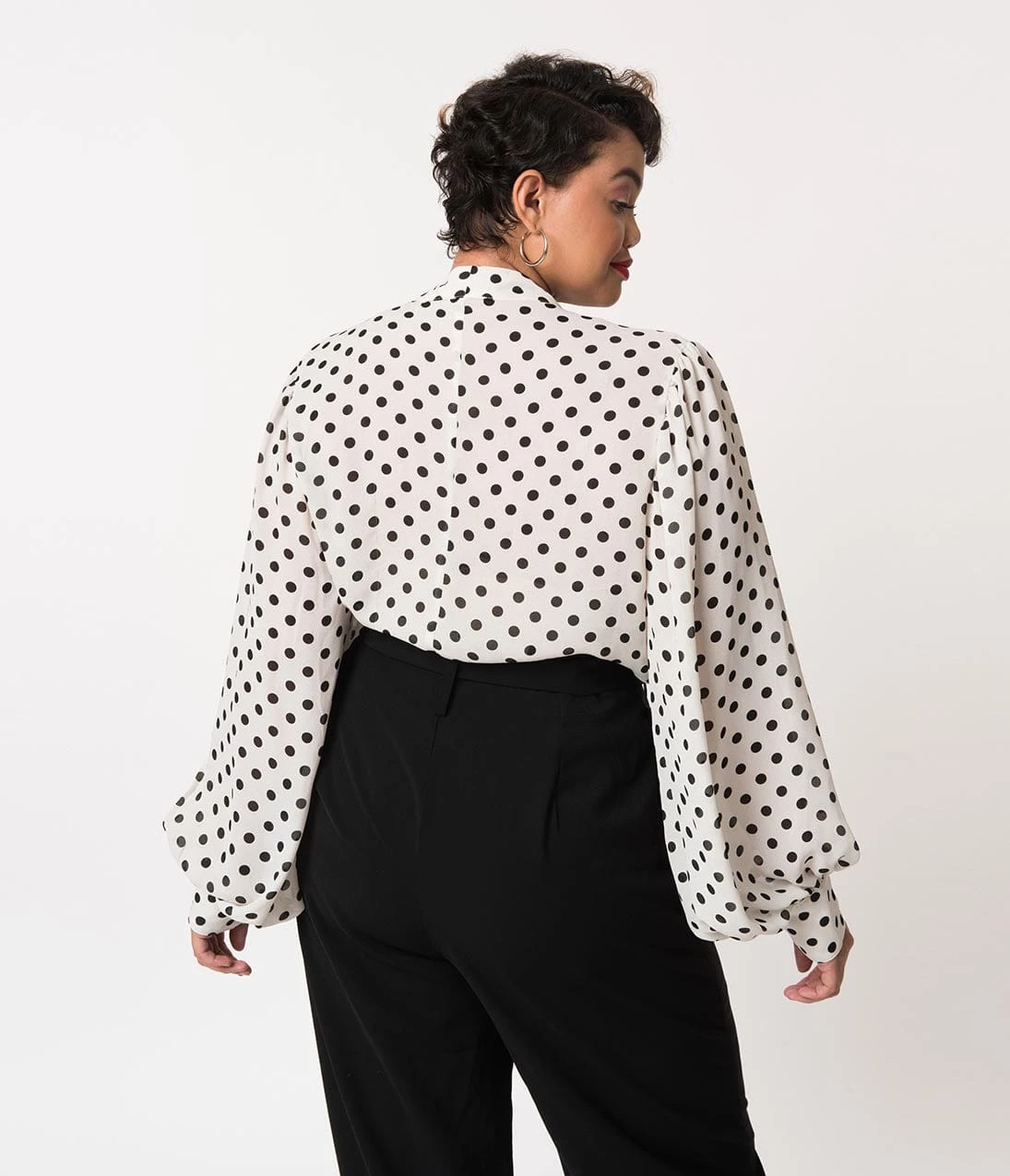 You need an attitude, darling! An eye-catching plus size separate with vintage glamour, the Gwen Blouse from Unique Vintage will get your opinion heard. Crafted in a lightweight crepe, this divine curvy piece is cast in a crisp ivory white and boasts a striking amount of black polka dots throughout. The button up form of this semi-sheer top leads to a stunning attached neck tie that provides a beautiful embellishment to your visage. The billowing long sleeves leads to button cuffs for a dramatic silhouette that leaves them speechless!