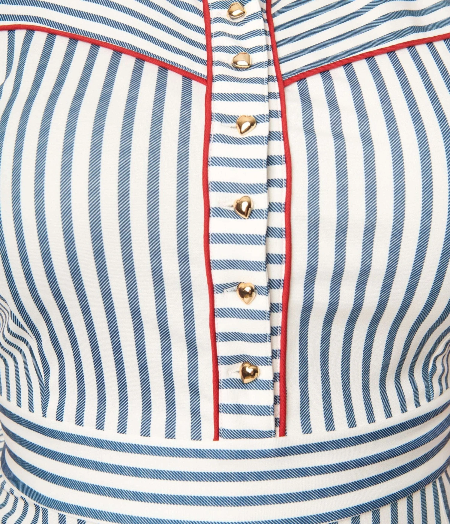 This delightful nautical style dress is crafted in a marvelous stretch blend in a navy blue stripe throughout the ivory white backdrop. The golden heart button up bodice dances with sweet red piping, set in a sleeveless design. Complete with mid side zipper.