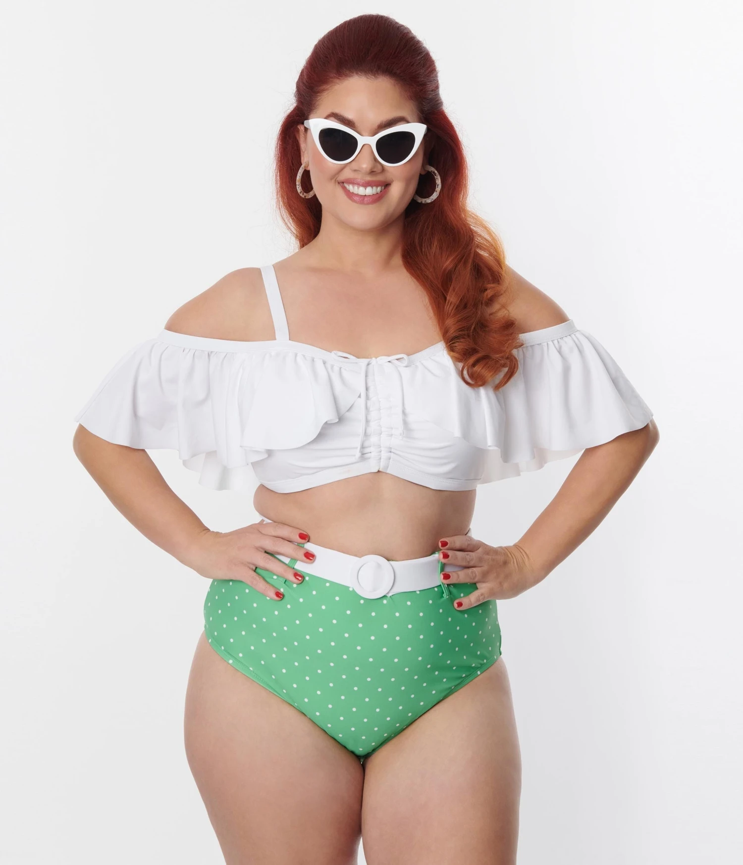 Be the first to review “Unique Vintage Plus Size White Ruffle Swim Top” Cancel reply