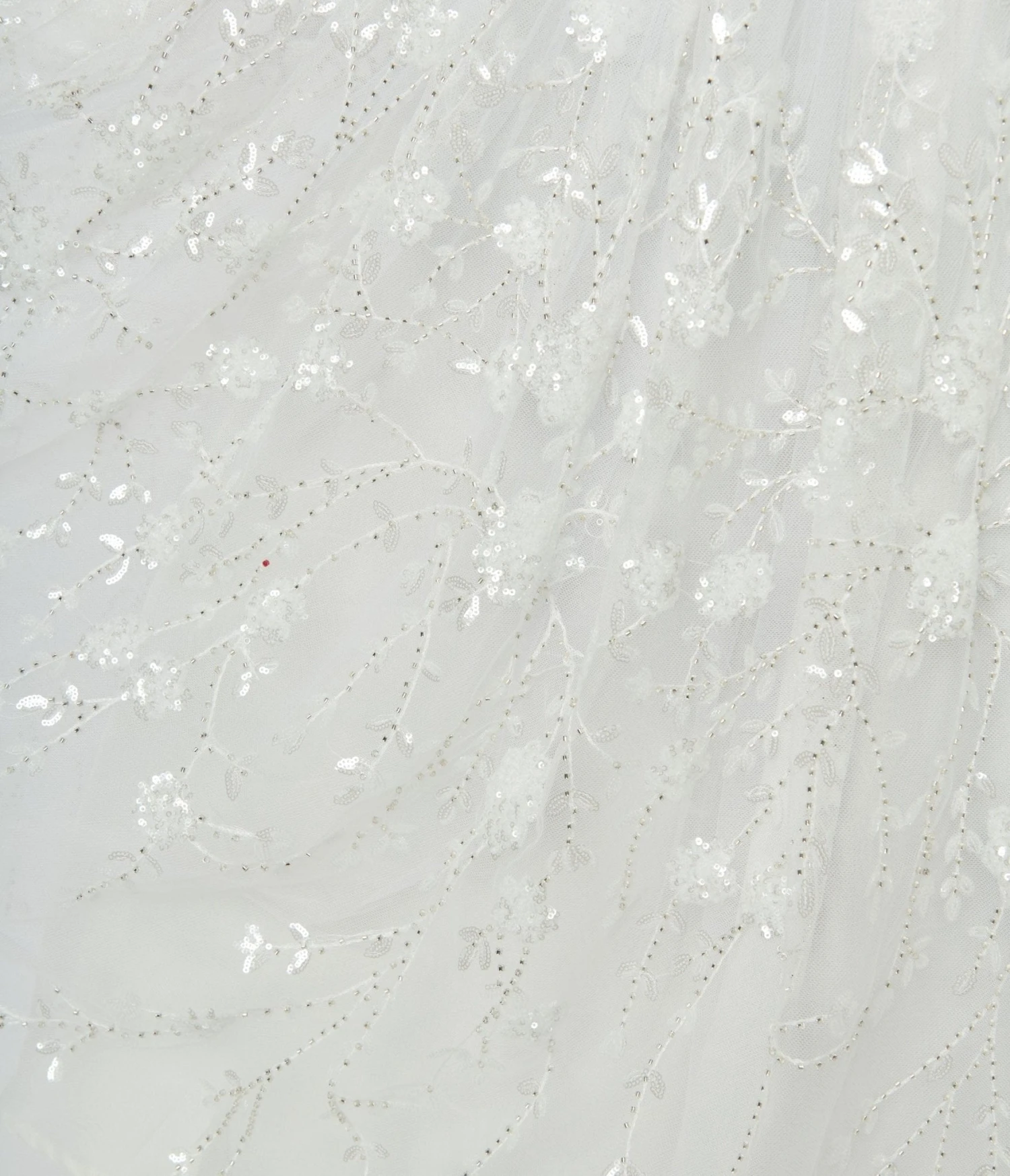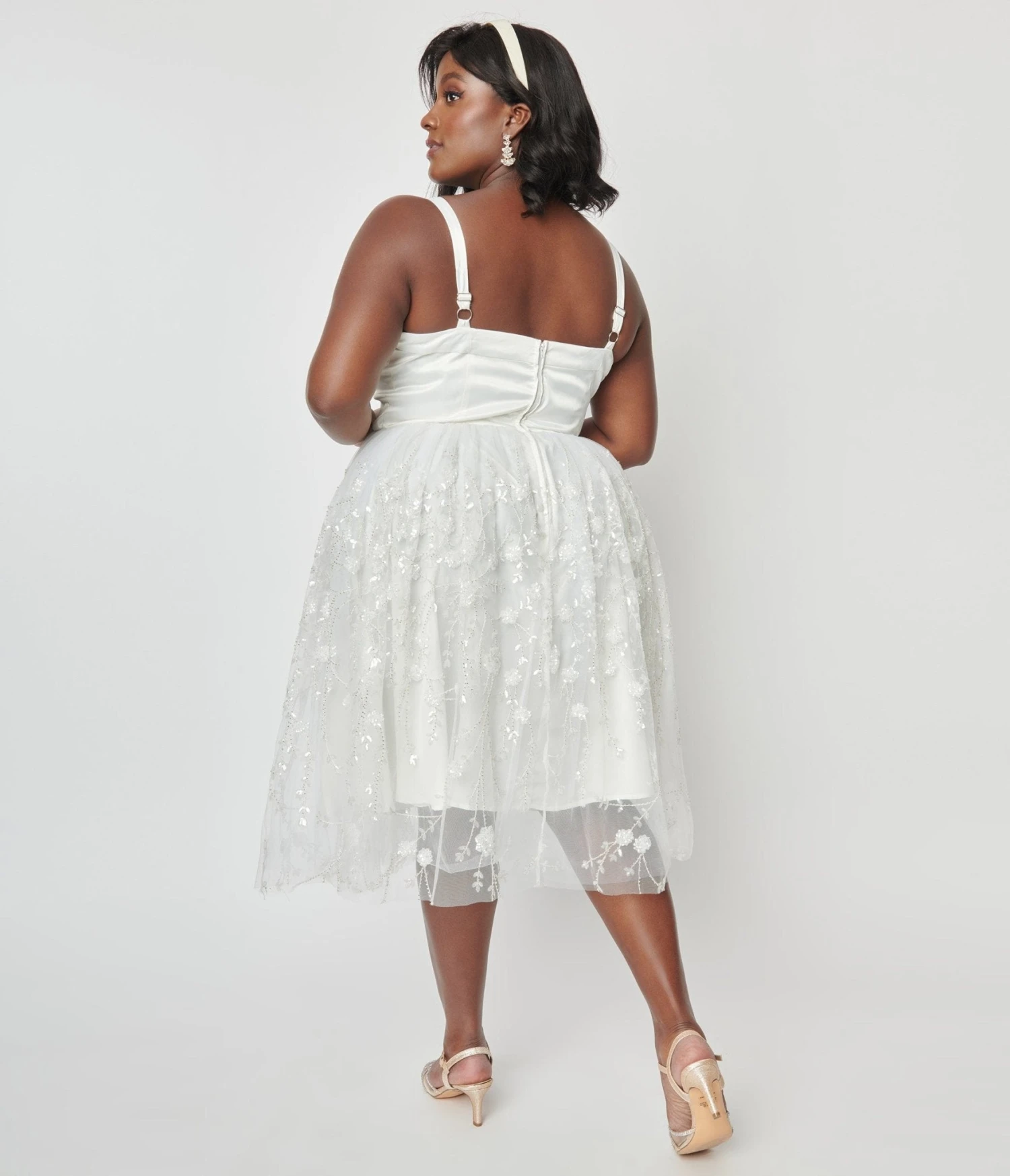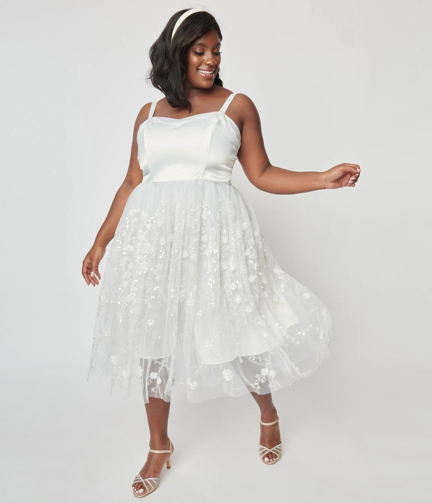 This plus size swing dress is crafted in a divine white tulle and boasts sequins and floral beading along the border over white lining. The satin-style sweetheart bodice is supported by adjustable spaghetti straps, while the seamed waist is cinched with a back zipper.