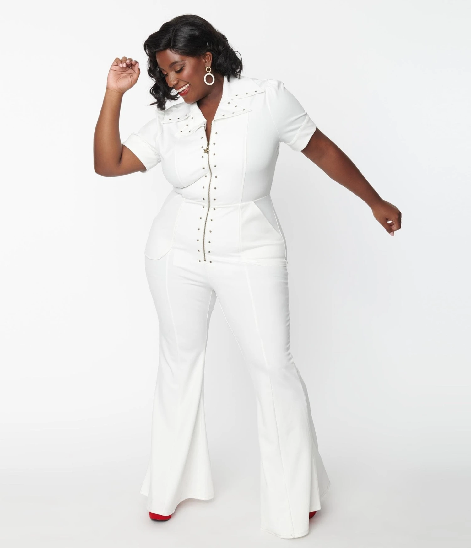 Shake your hips in this stunning plus size white jumpsuit, crafted in a knit blend that features en embroidered patch on the back with a guitar and the front, ‘Rock & Roll’ & ‘1952’. Complete with a front zipper, side pockets, studded stars throughout, and a wide leg.
