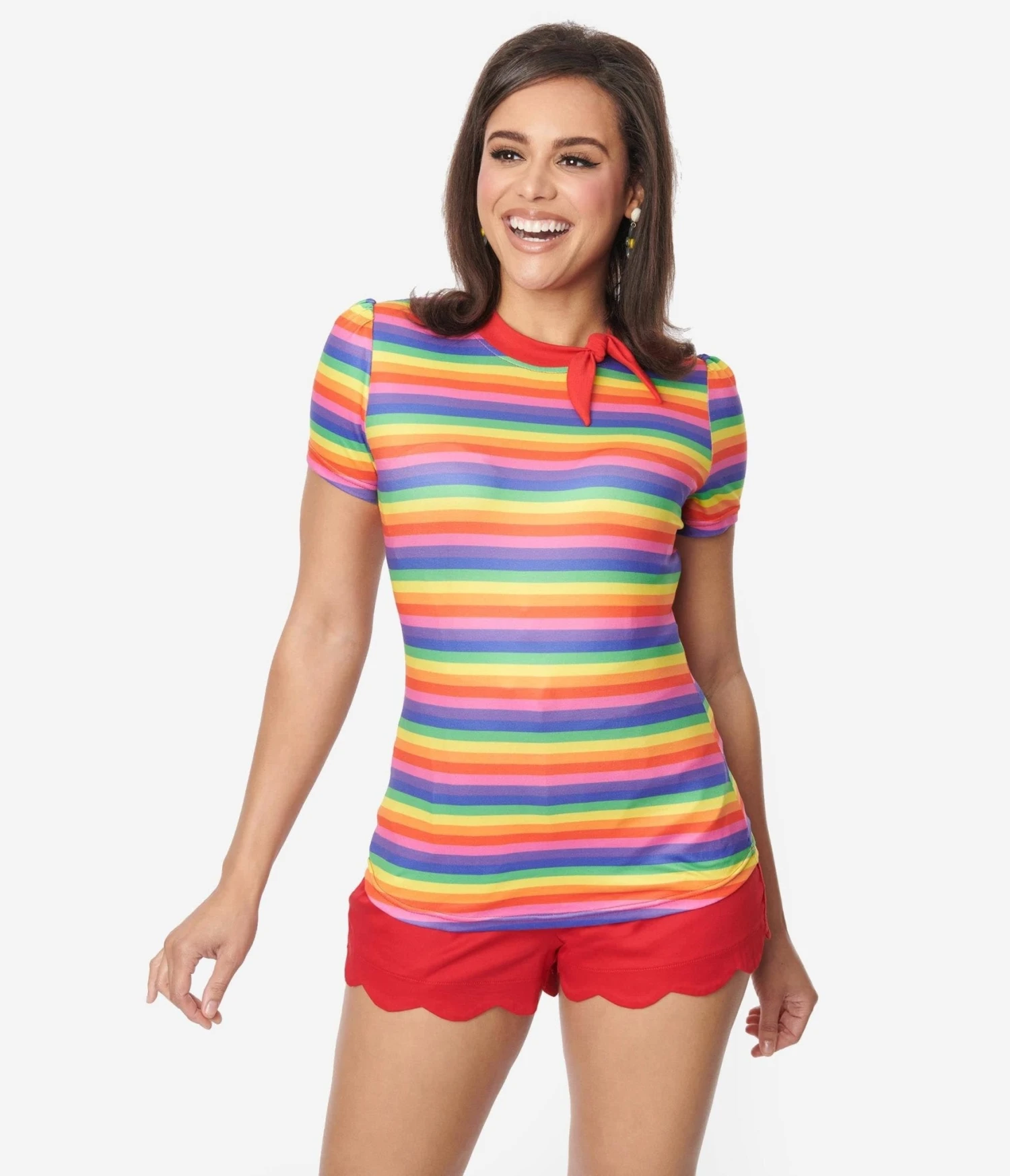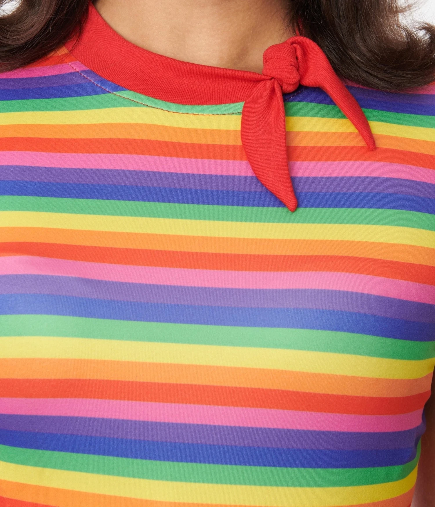 This sweet 1960’s style top from Unique Vintage is crafted in a fabulous rainbow striped knit. Outfitted with a modest neckline, attached red neck tie, and short sleeves.