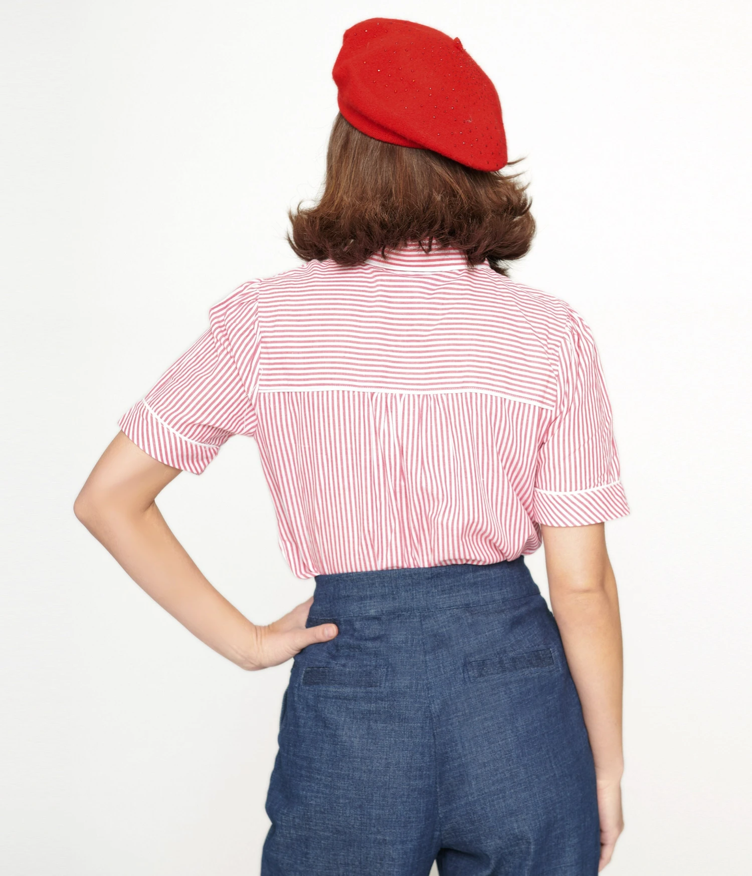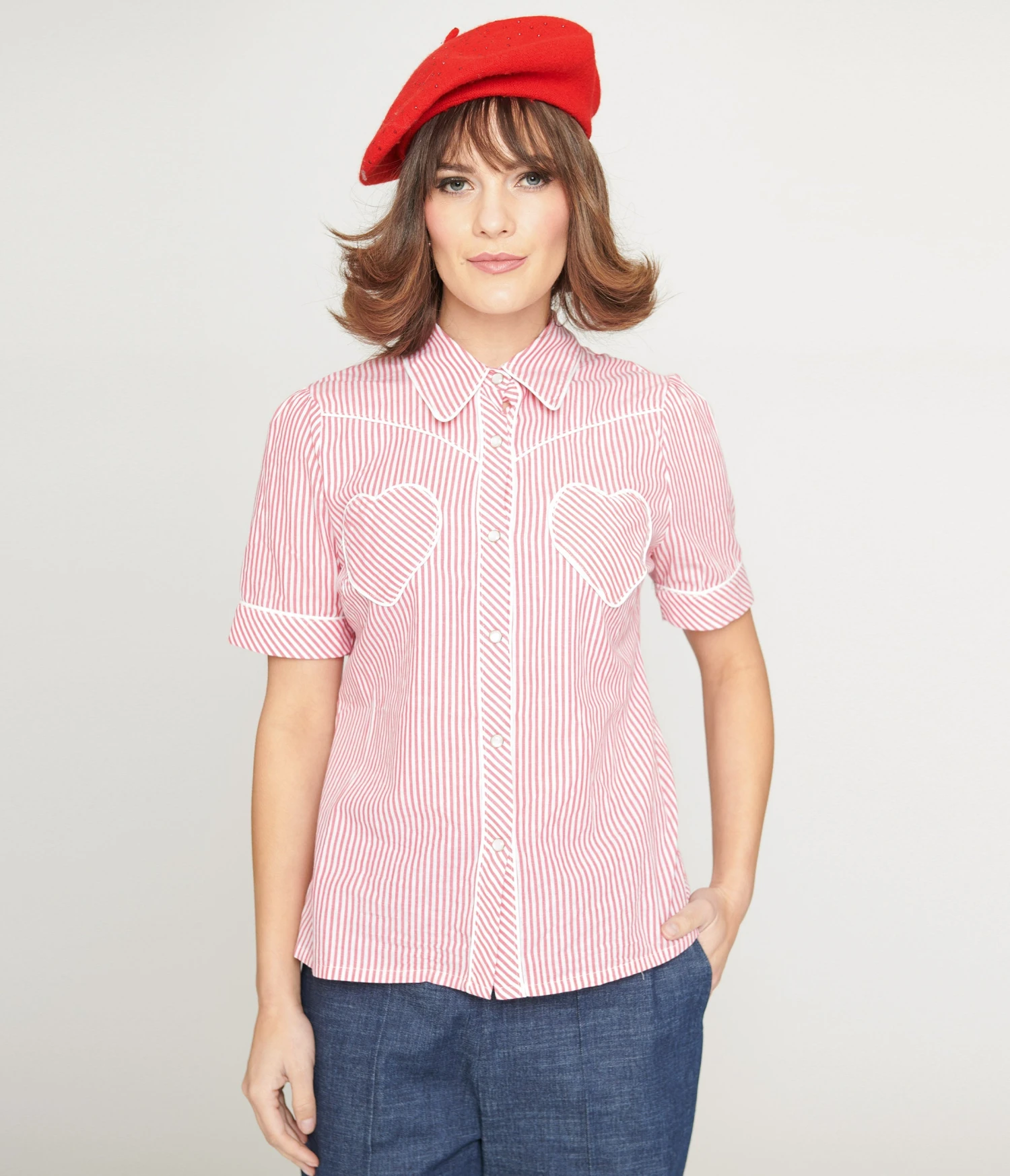 This charming woven top is a must-have addition to your wardrobe. Its playful red and white stripes give it a timeless appeal, reminiscent of the classic 1940s style. The heart-shaped chest pockets add a sweet touch, while the collared neckline adds an extra dash of sophistication. You’ll adore how easy it is to slip into this top with its convenient snap button down front. Perfect for sunny days or layering under your favorite cardigan, this short-sleeved beauty will make you feel like a retro fashion icon.