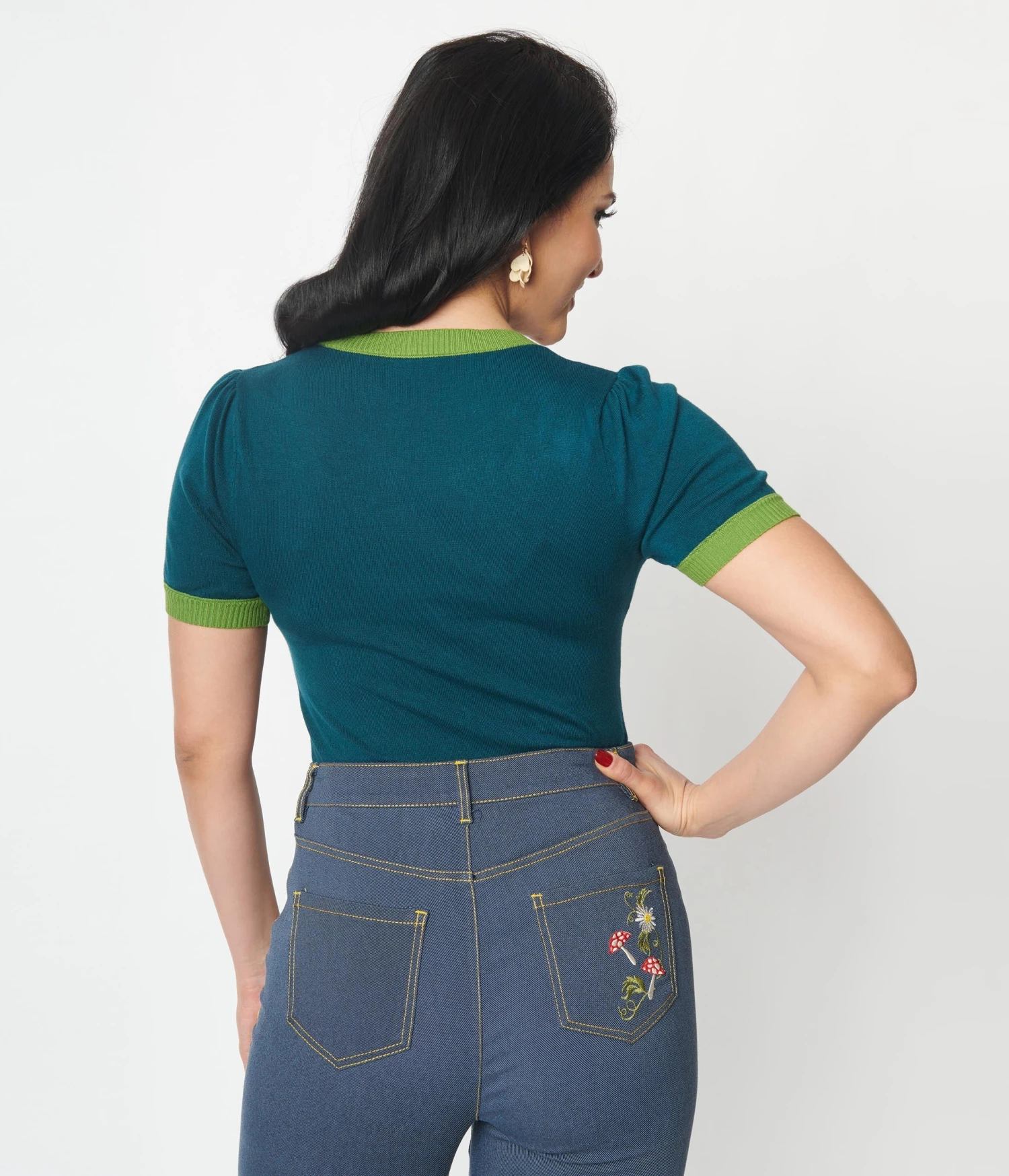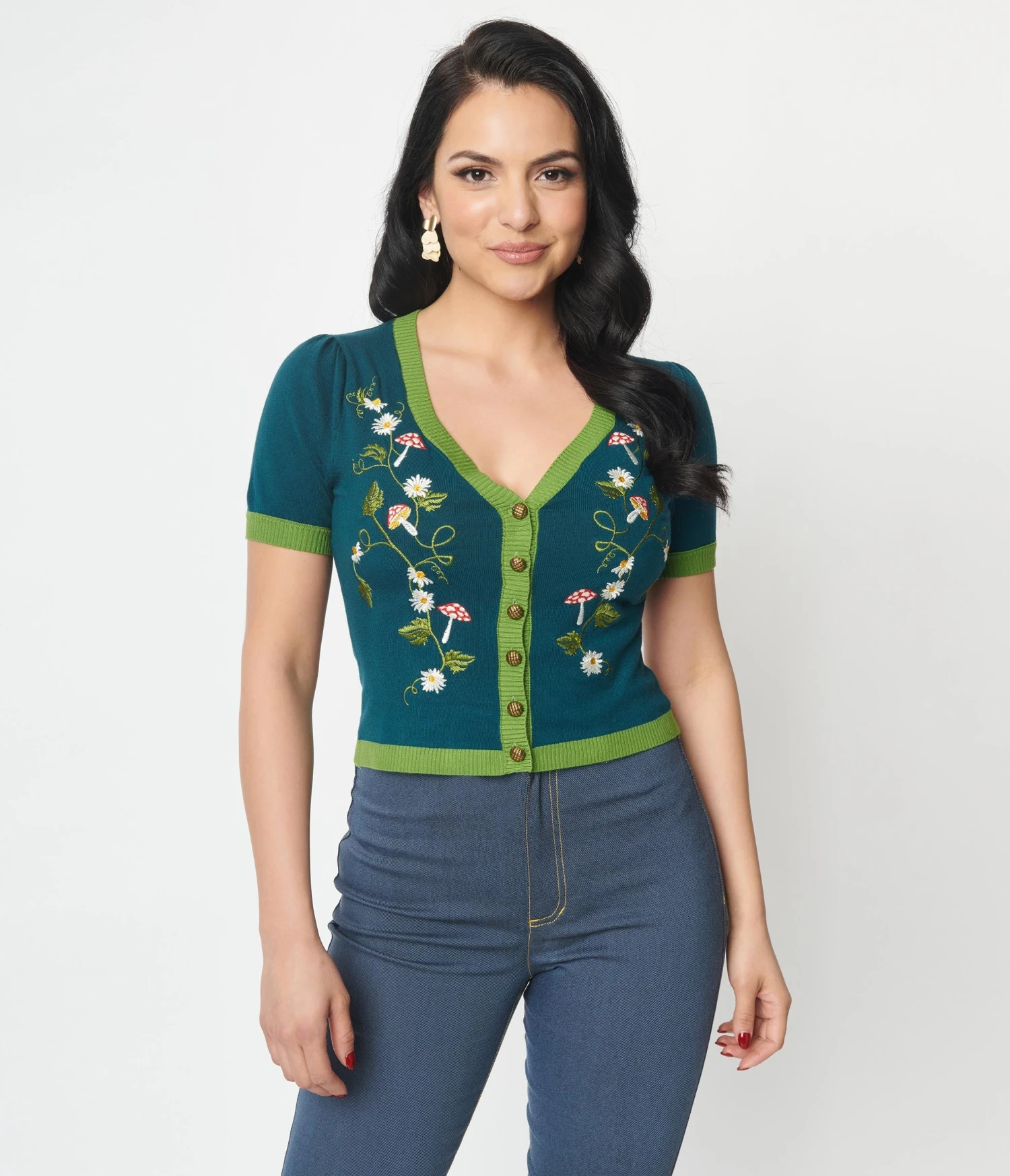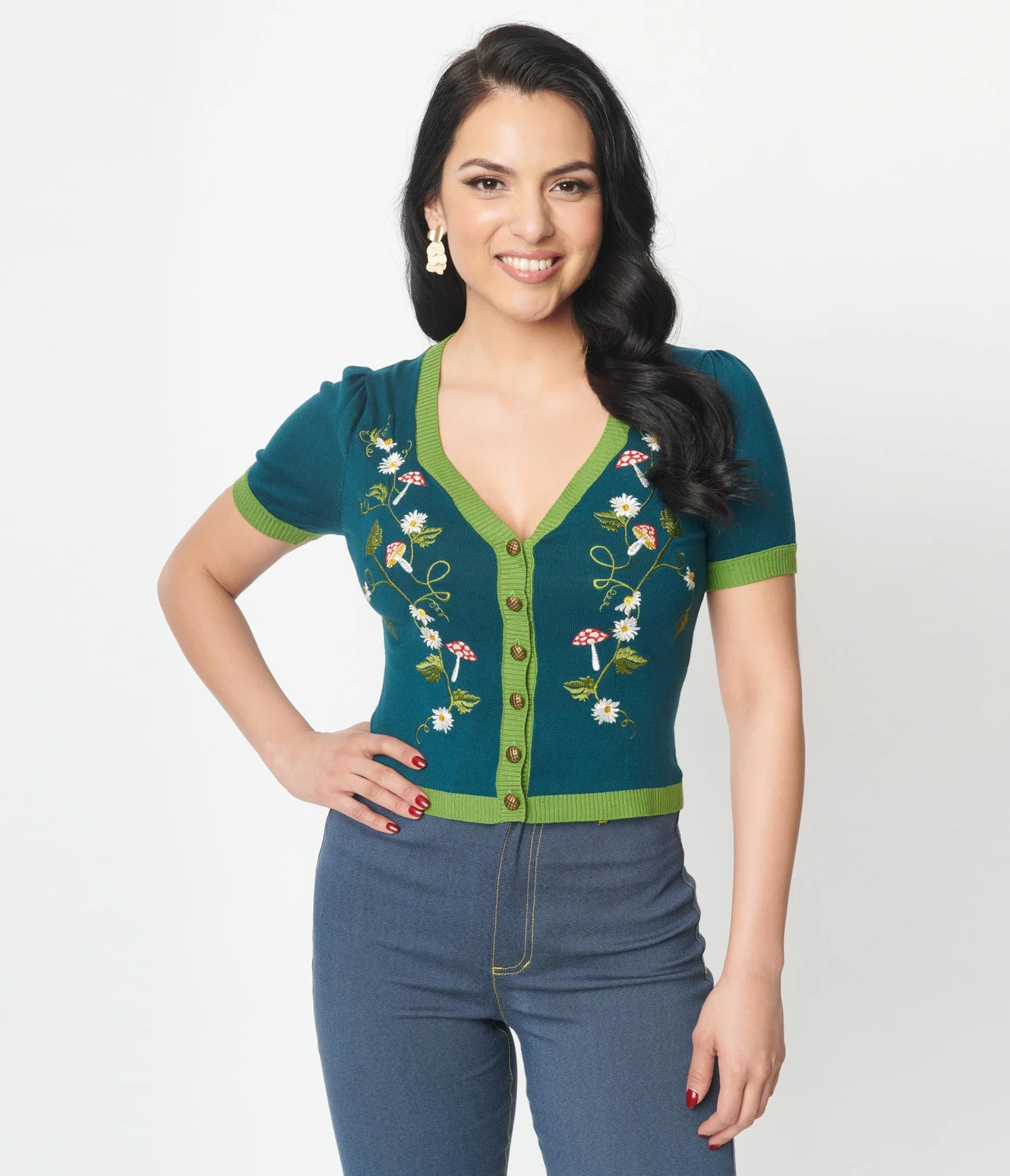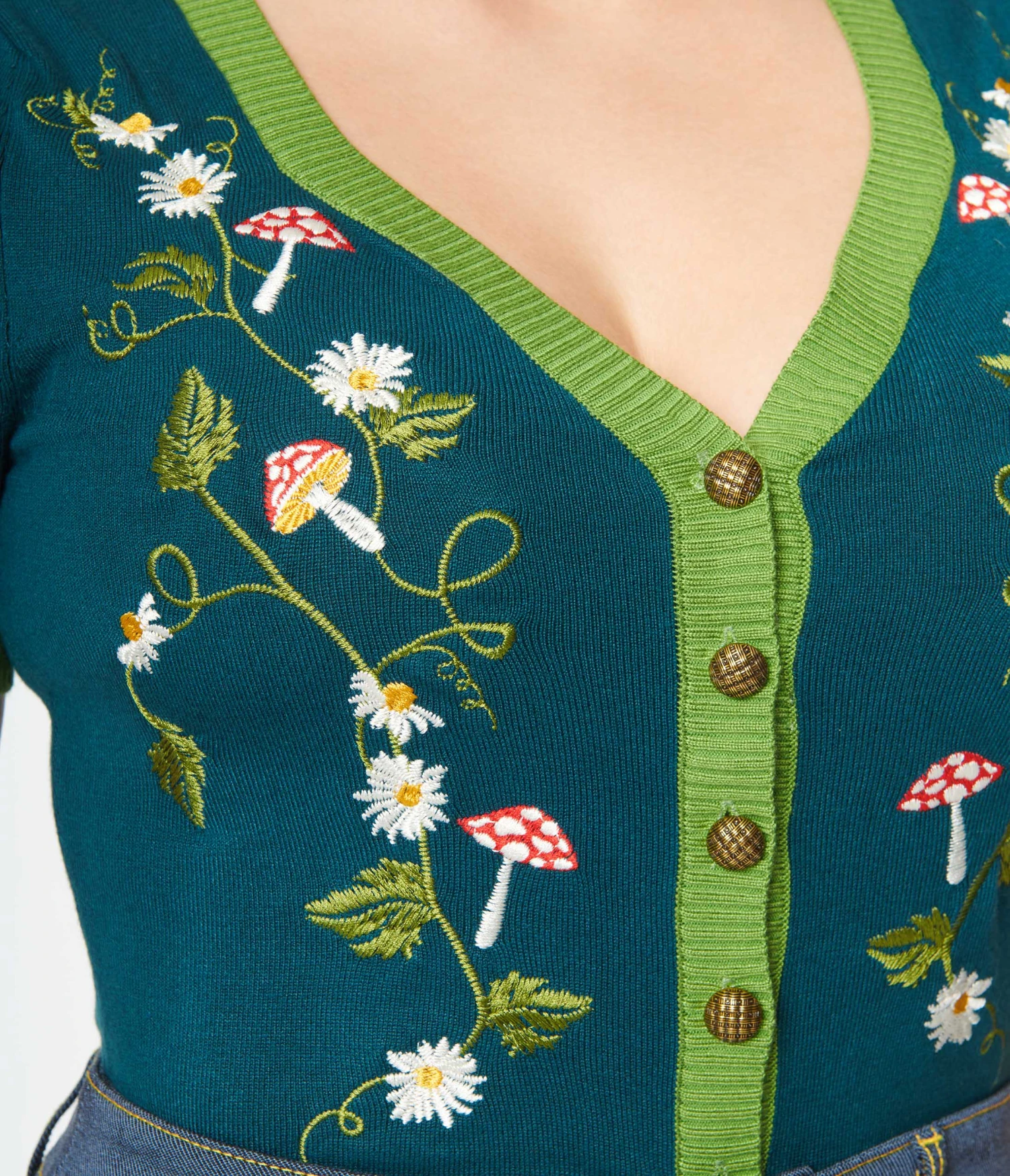 This charming 1950s style cardigan is crafted in a soft teal knit fabric with green piping featuring a mushroom and daisy embroidery. Complete with a lovely heart button up front framed with short sleeves.