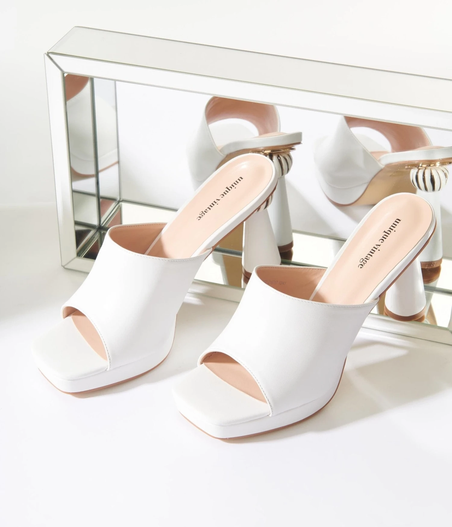 A quirky pair of fun mule heels from Unique Vintage, these funky kicks are crafted in an ivory white leatherette. The 5 inch lift features a unique ball heel for extra flare. Complete with an open toe and cushion insole for comfortable boogies!