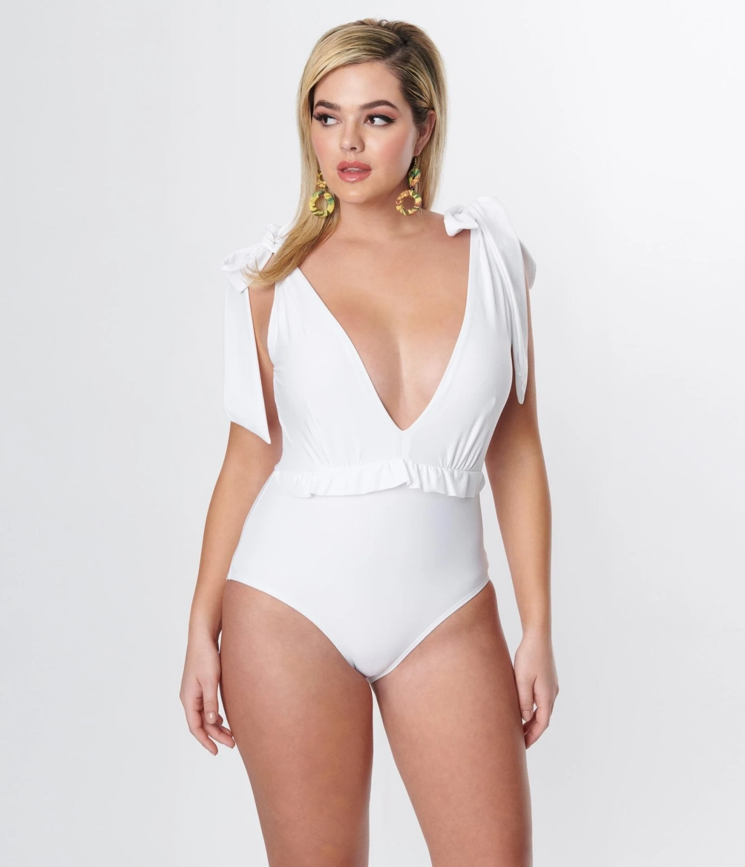 A heart-stopping plus size one piece swimsuit, cast in solid white and featuring a plunging neckline, secured with self tie shoulder straps.